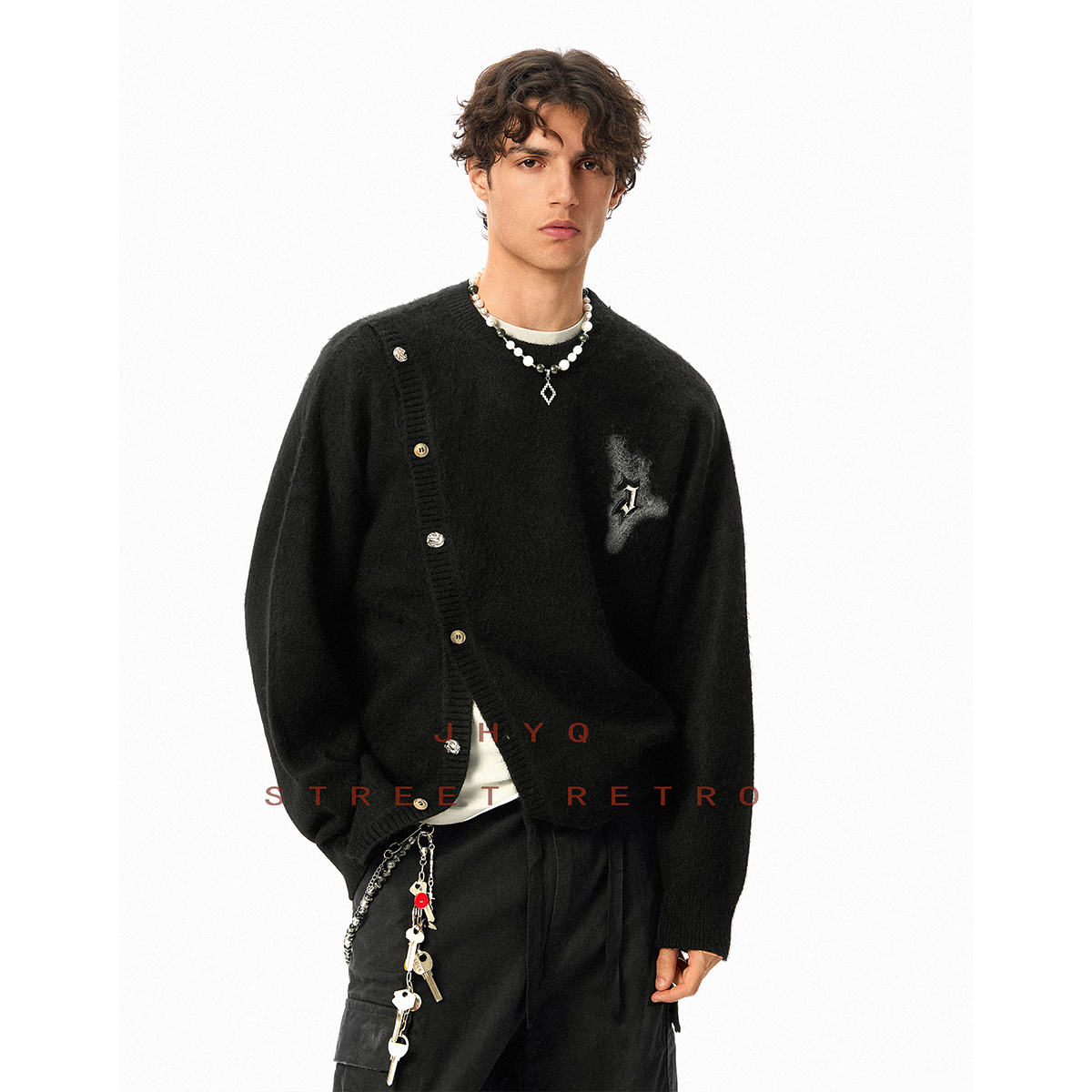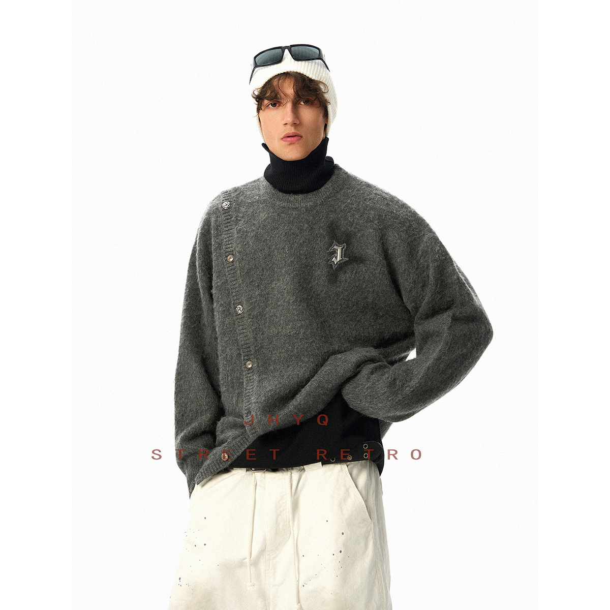 宽松复古毛衣外套女 新款 BEASTER鬼脸刺绣图案连帽针织开衫 男秋季