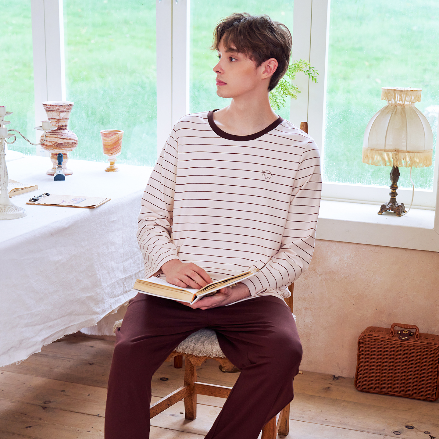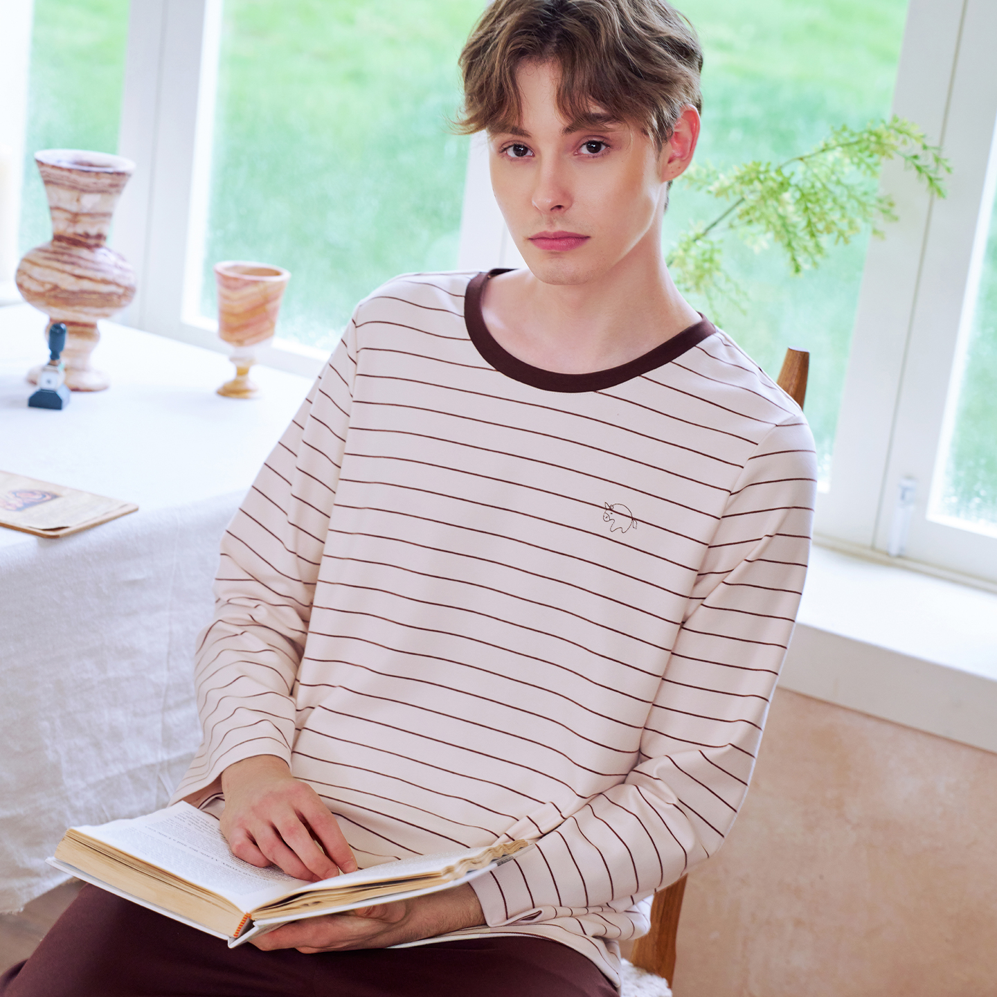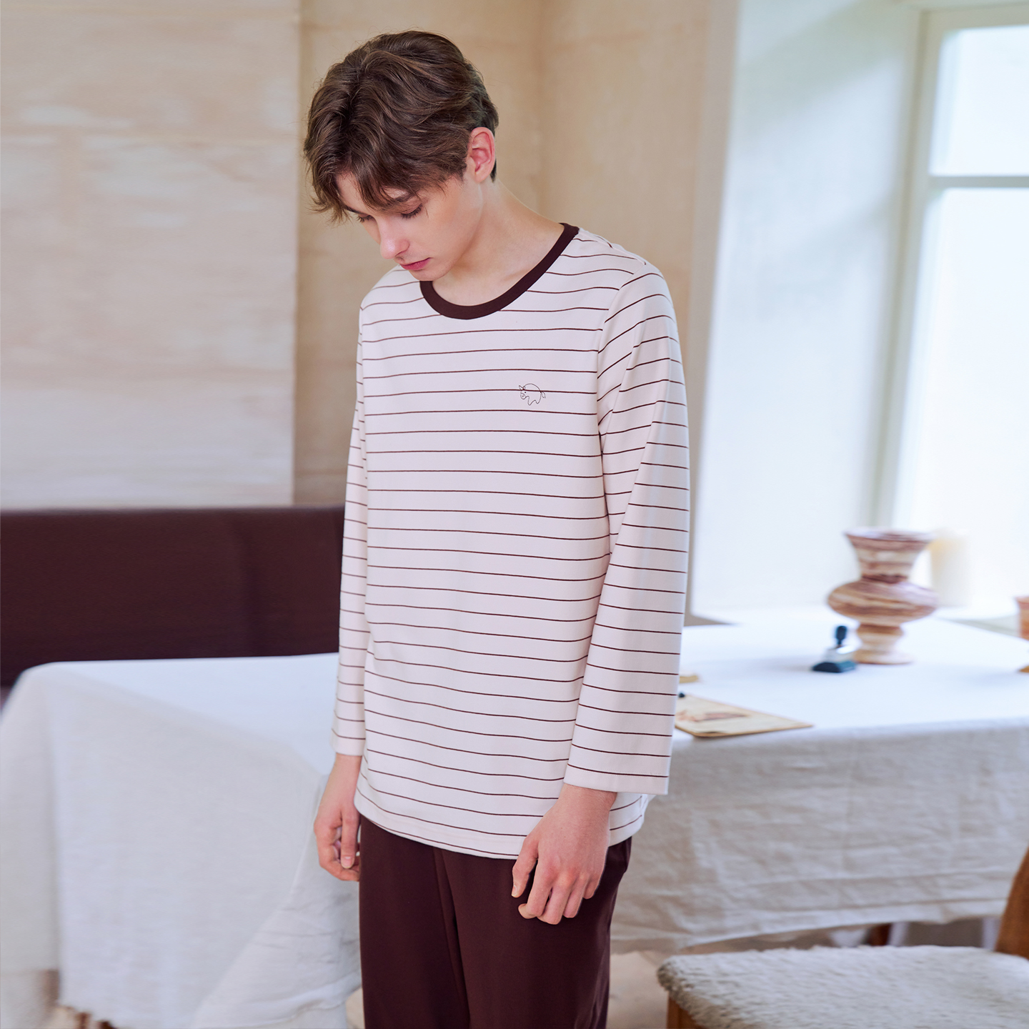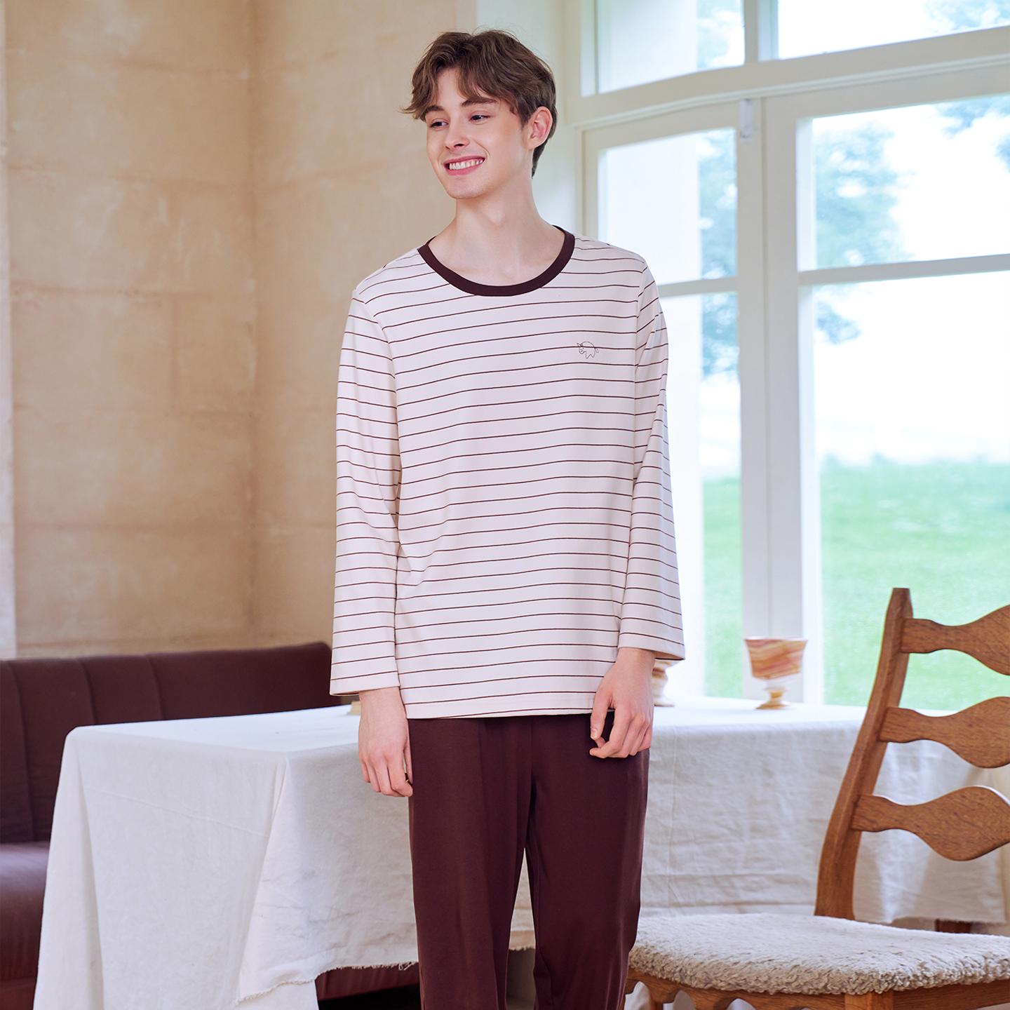 休闲条纹针织全棉可外穿家居服套装 纯棉睡衣男士 长袖 美标秋冬新款