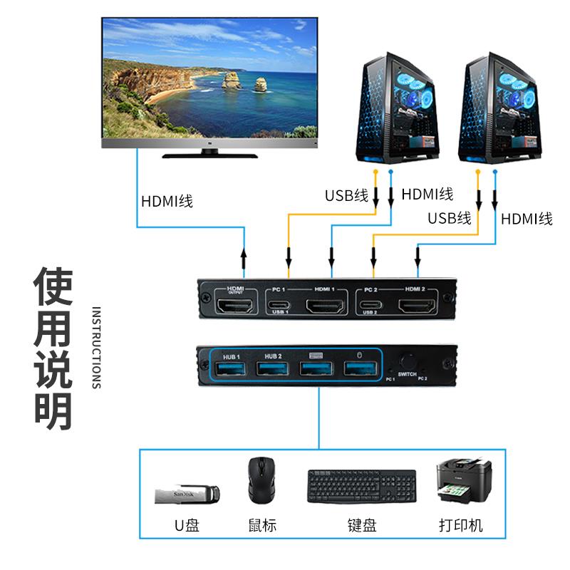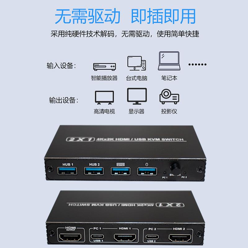 hdmi kvm切换器二进一出2切1多台电脑主机共享显示屏打印机USB鼠标键盘笔记本同屏分屏高清线二进一出分配器