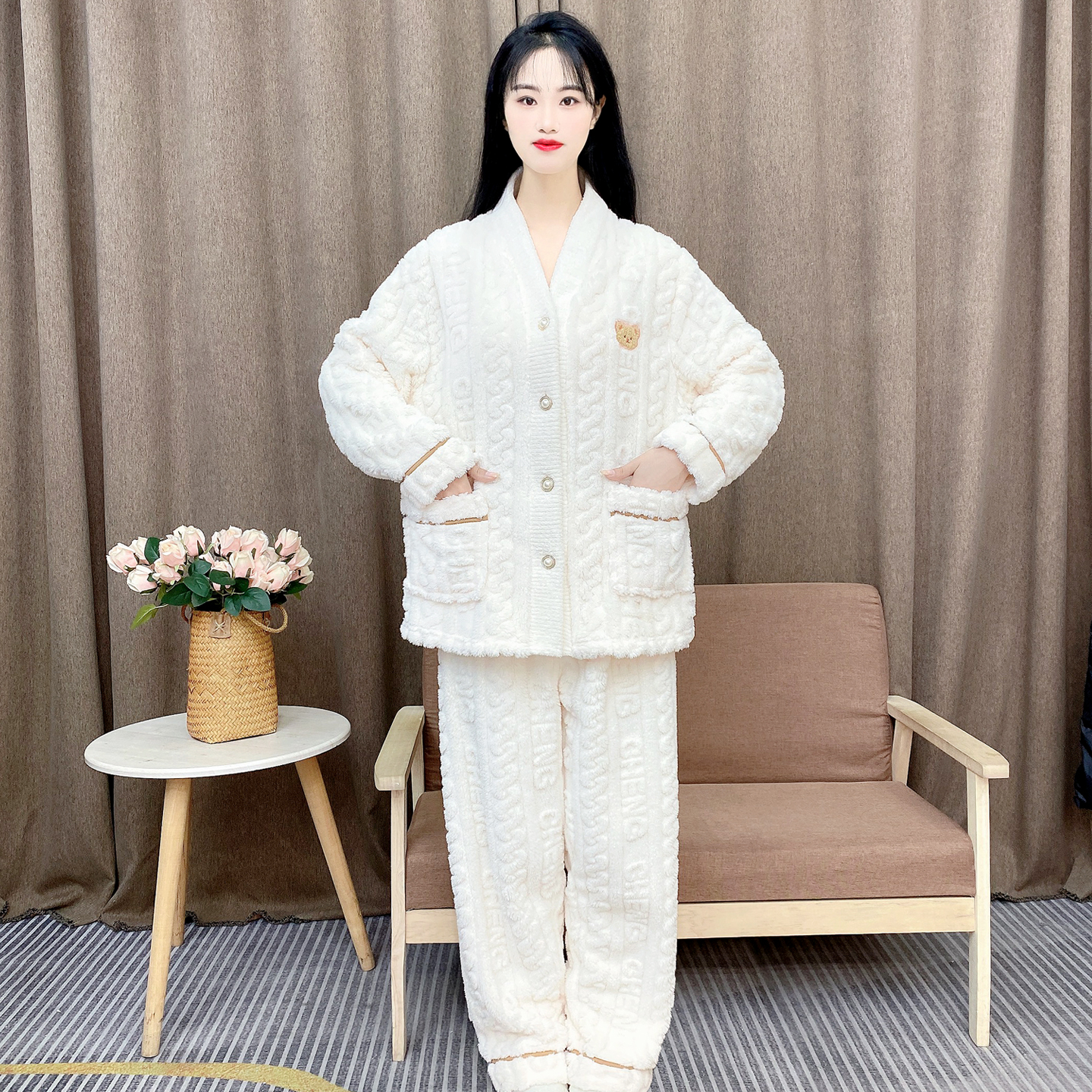 套装 女加厚保暖秋冬法兰绒家居服加肥加大码 珊瑚绒睡衣妈妈款 冬季
