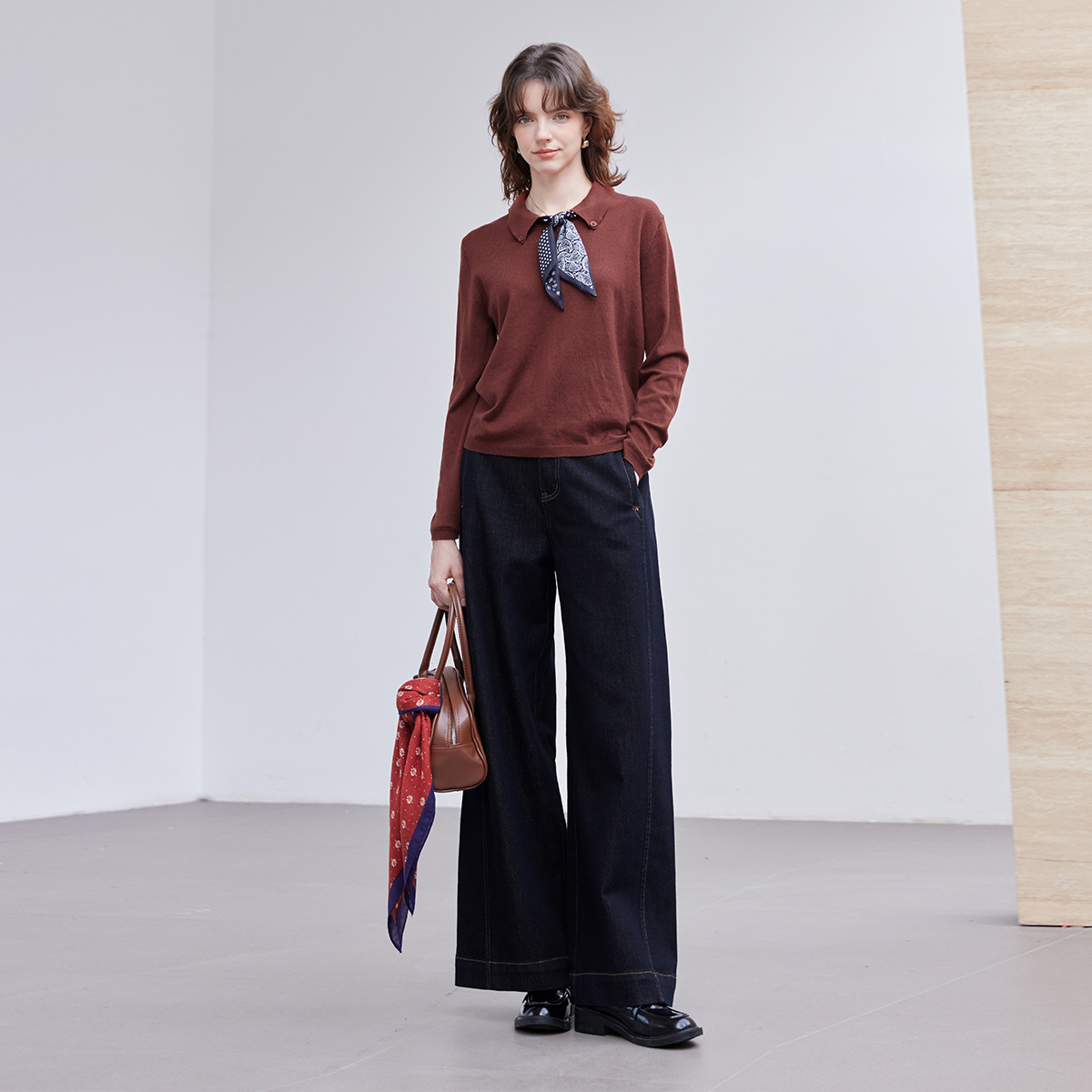 女 针织上衣复古通勤简约针织衫 纳纹25秋季 POLO领飘带长袖