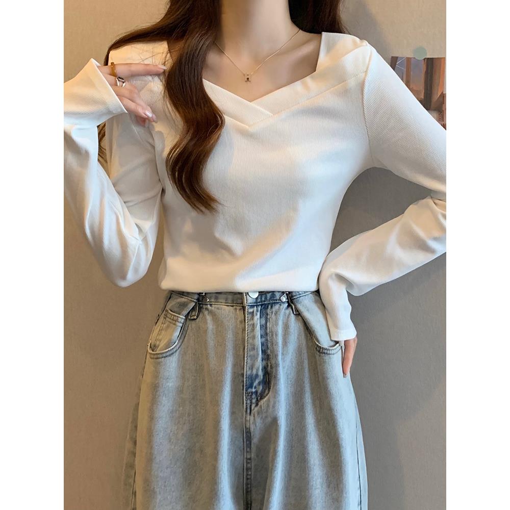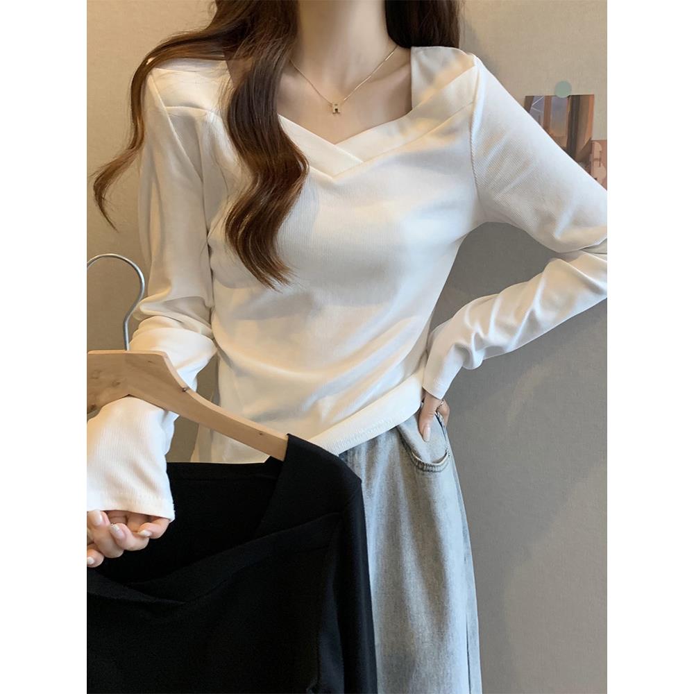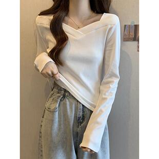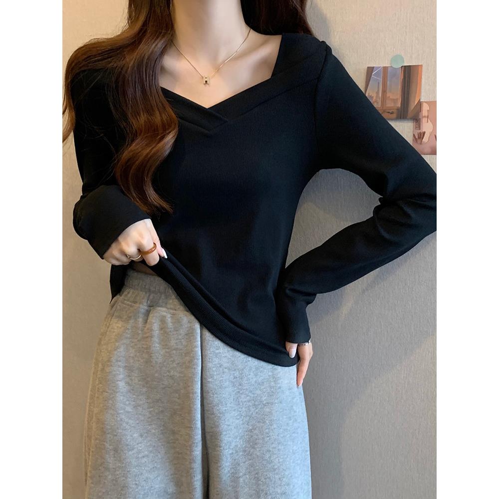 胖mm打底衫 t恤女春秋2025年新款 上衣 黑色V领正肩长袖 大码