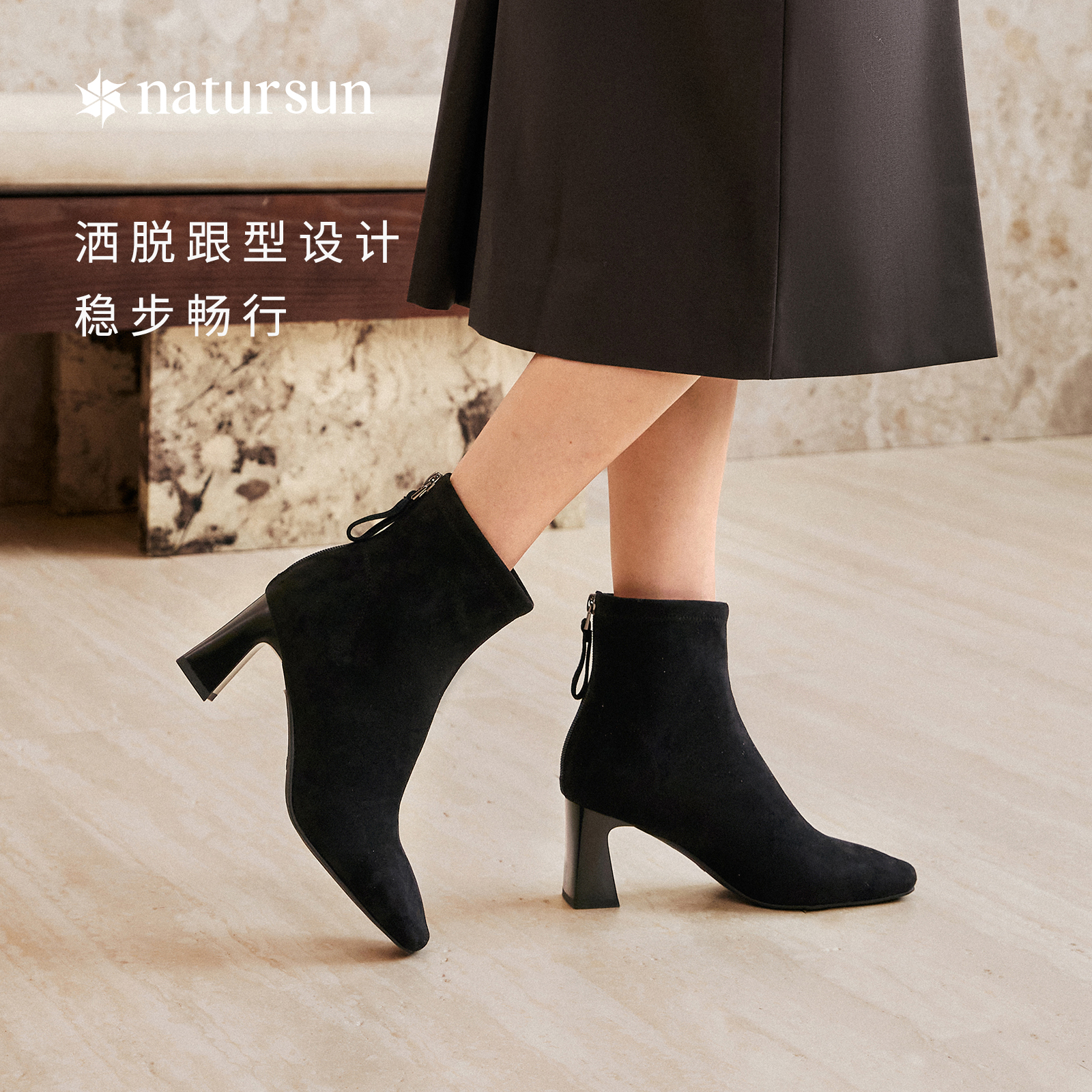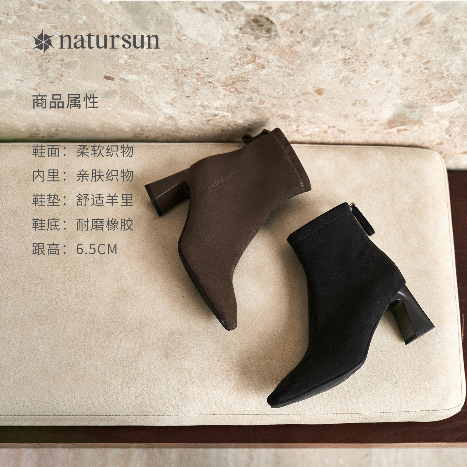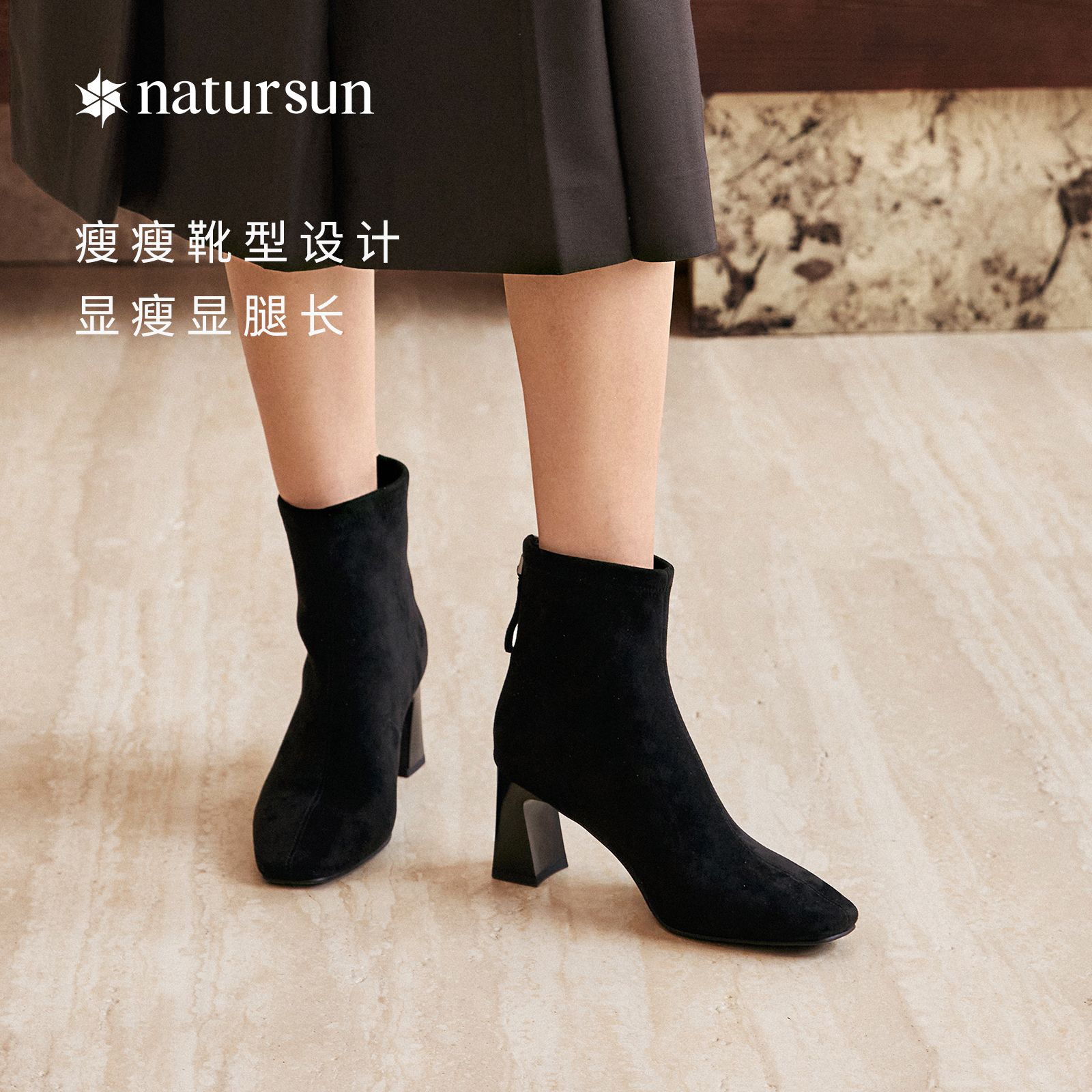 natursun粗跟高跟弹力靴女士2025冬季 复古气质短筒靴显瘦袜靴 新款