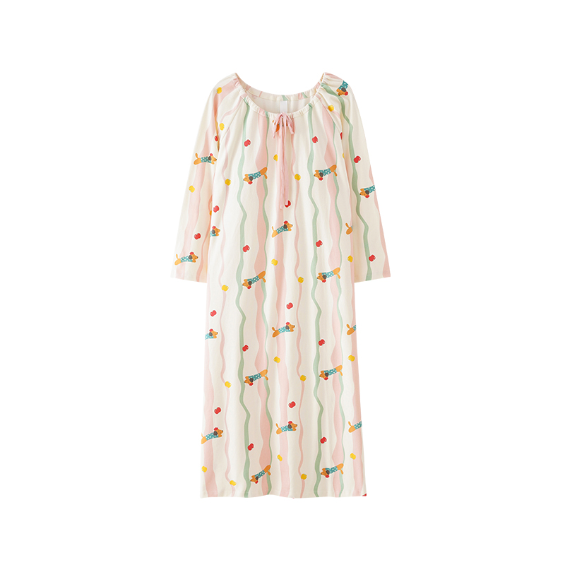 中长款 款 连衣裙家居服 长袖 猫人纯棉带胸垫女士睡裙2025春秋新款