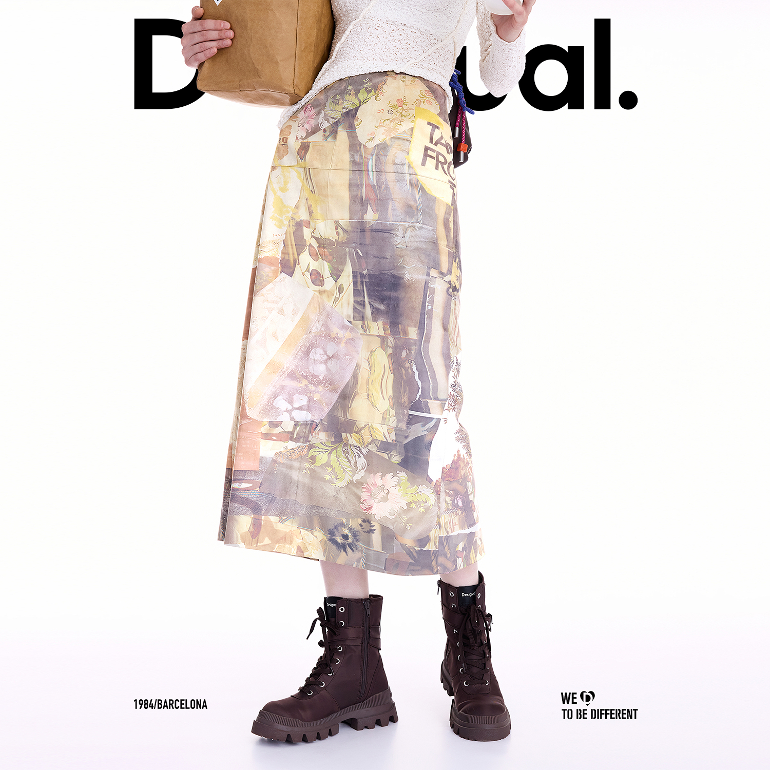 Desigual25秋冬新品 半身裙 麂皮感手绘拼贴插画印花直筒中长款