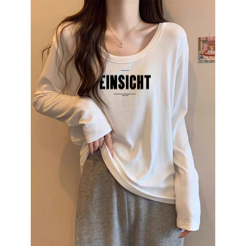 宽松显瘦上衣秋冬磨毛内搭打底衫 白色U领正肩t恤女春秋季 纯棉长袖