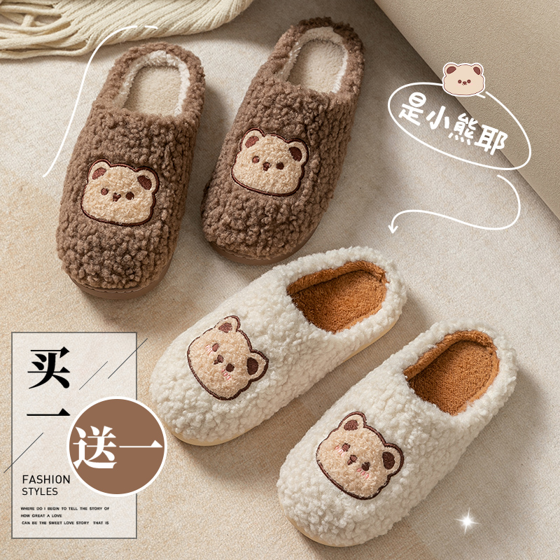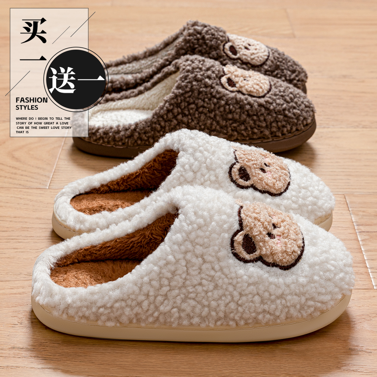 室内家居加绒厚底一对包头毛拖鞋 冬季 秋冬男 女款 买1送1情侣棉拖鞋