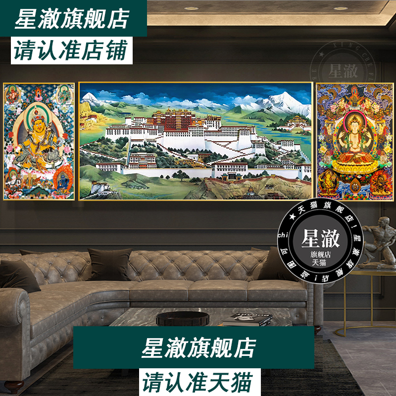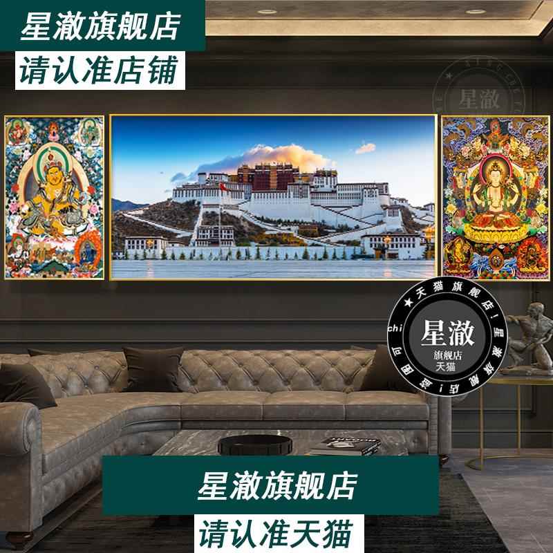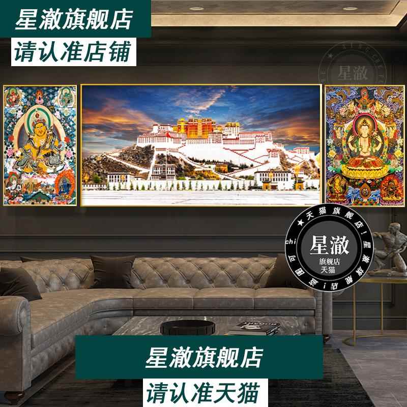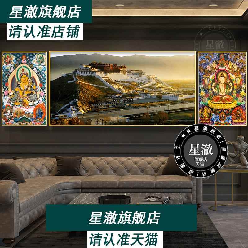 饰画客厅沙发背景墙壁画布达拉宫黄财神挂画三联画大幅 装 藏式 风格