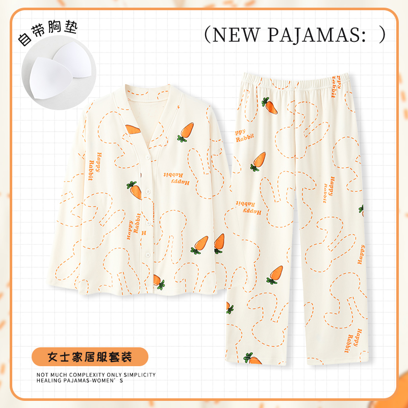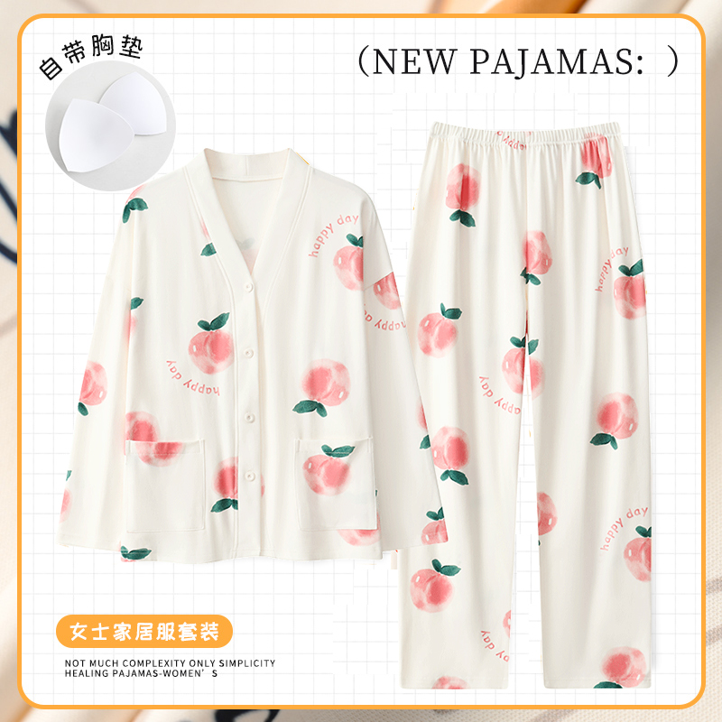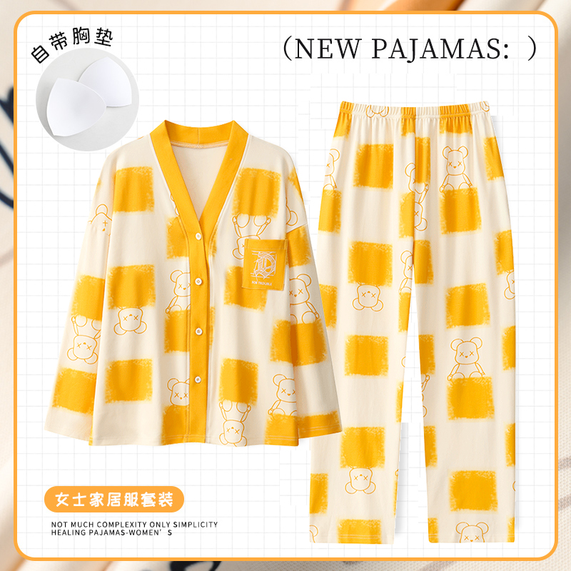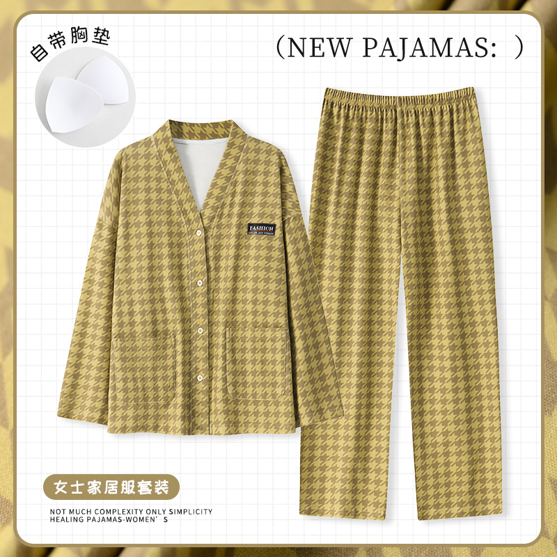休闲粉色千鸟格家居服 带胸垫一体气质简约大码 睡衣女秋冬长袖 开衫