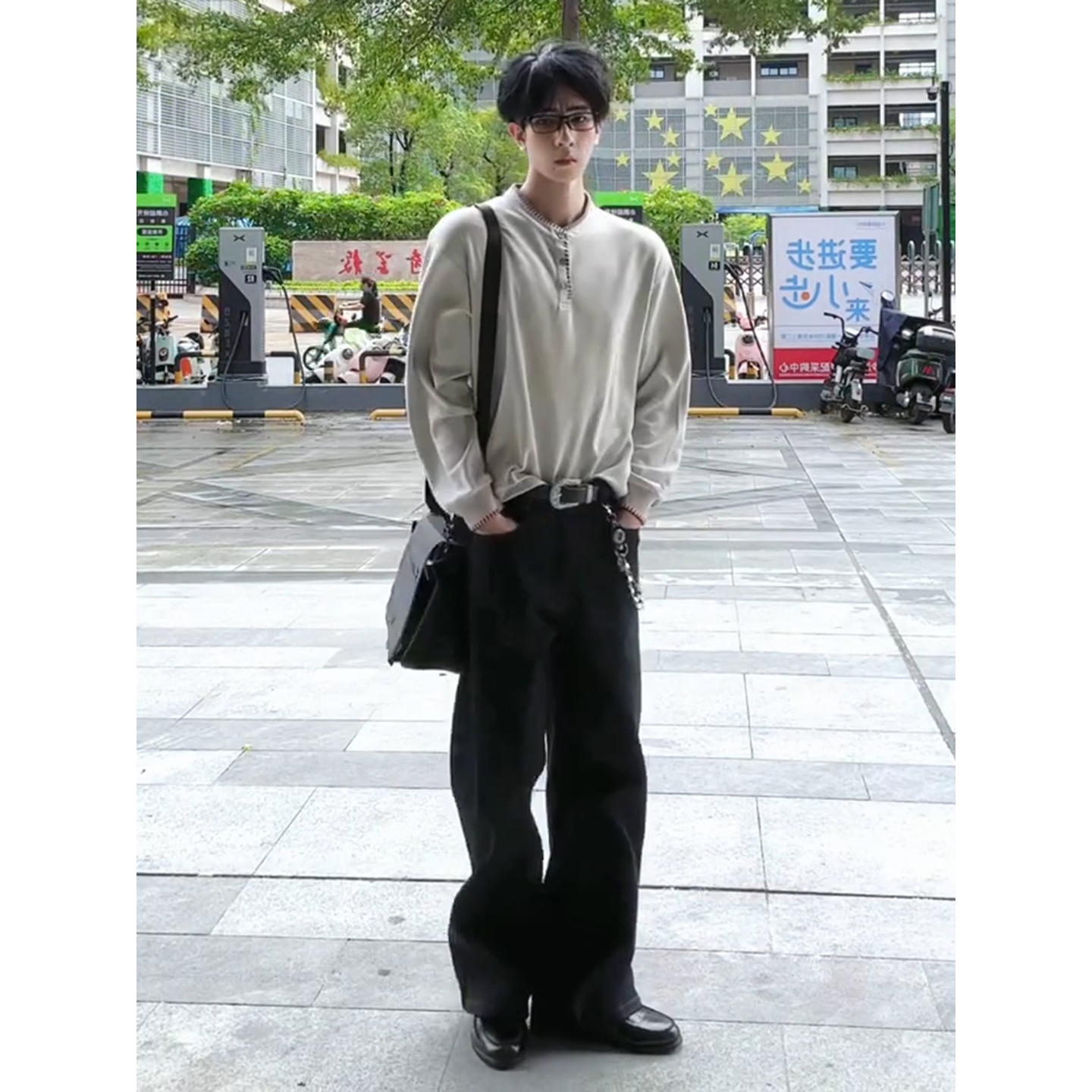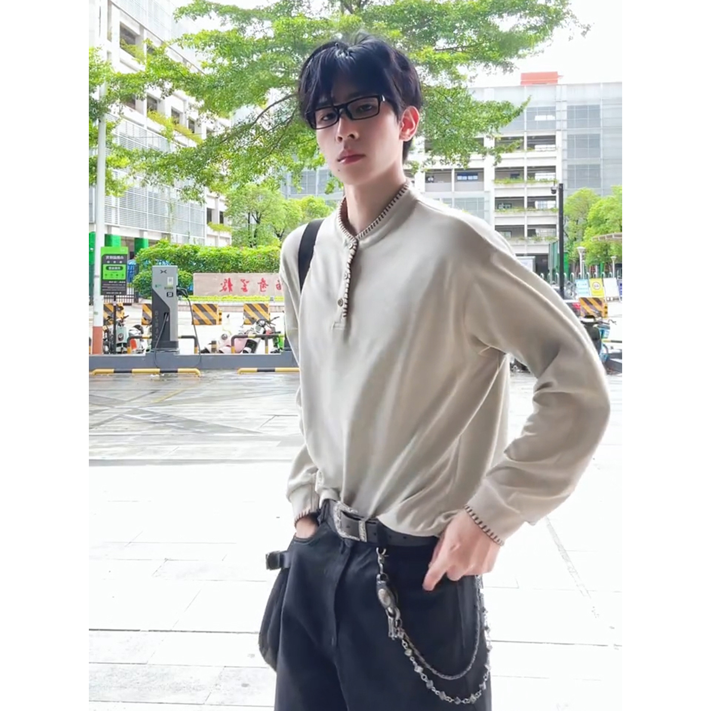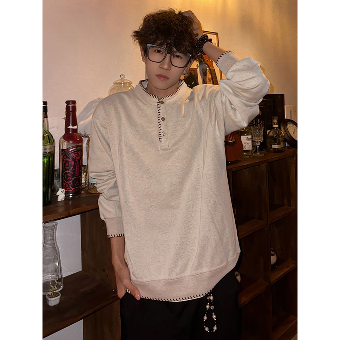 t恤垂坠感西装 高级感穿搭秋季 裤 套装 老钱风男装 手缝线亨利领长袖