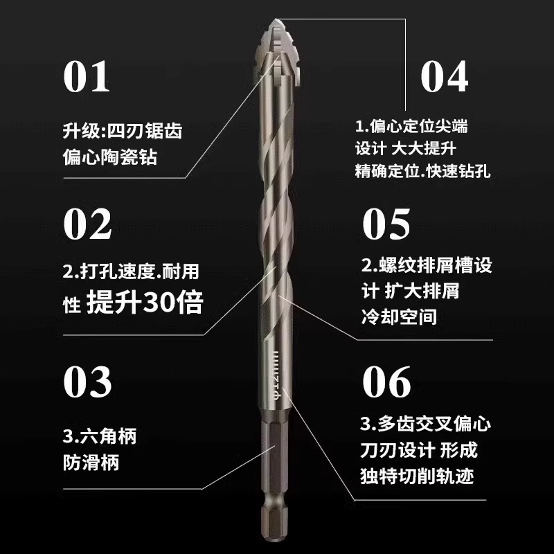 四刃锯齿偏心干打全瓷砖和陶瓷玻璃大理石混凝土合金钻头钻孔超硬