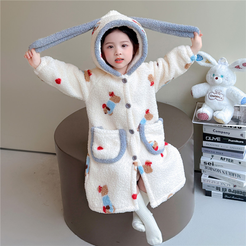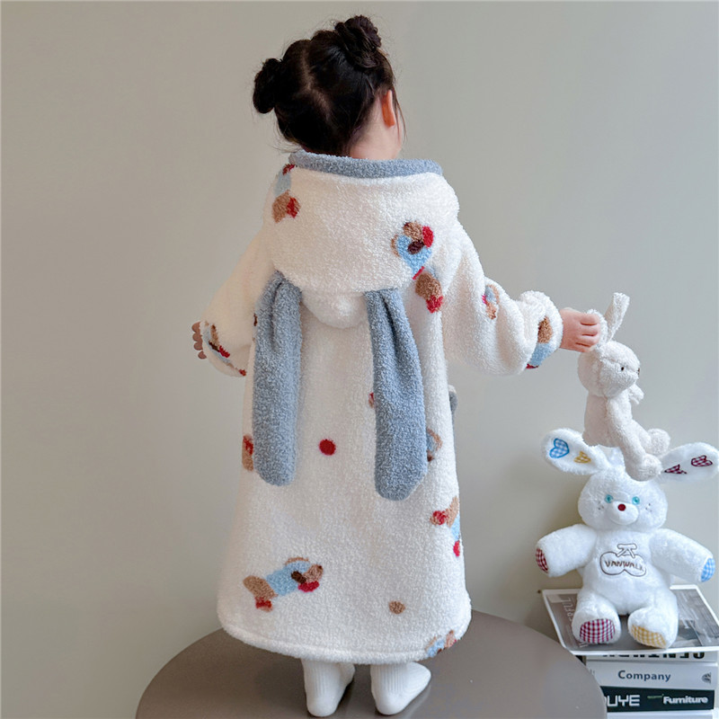 女童睡袍2025新款 儿童连帽法兰绒保暖家居服珊瑚绒宝宝浴袍 秋冬季