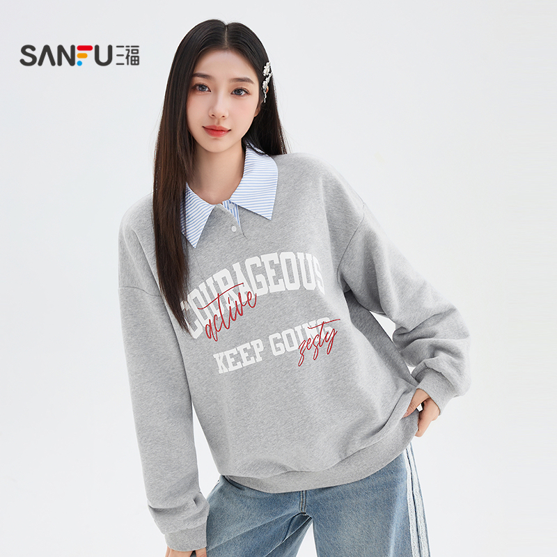 领假两件宽松上衣女装 三福无帽卫衣2025新款 字母加绒衬衫 美式 冬季