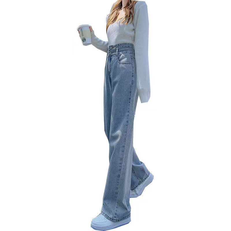 新款 女高腰春秋季 显瘦复古直筒裤 窄版 子 大码 百搭牛仔裤 阔腿牛仔裤