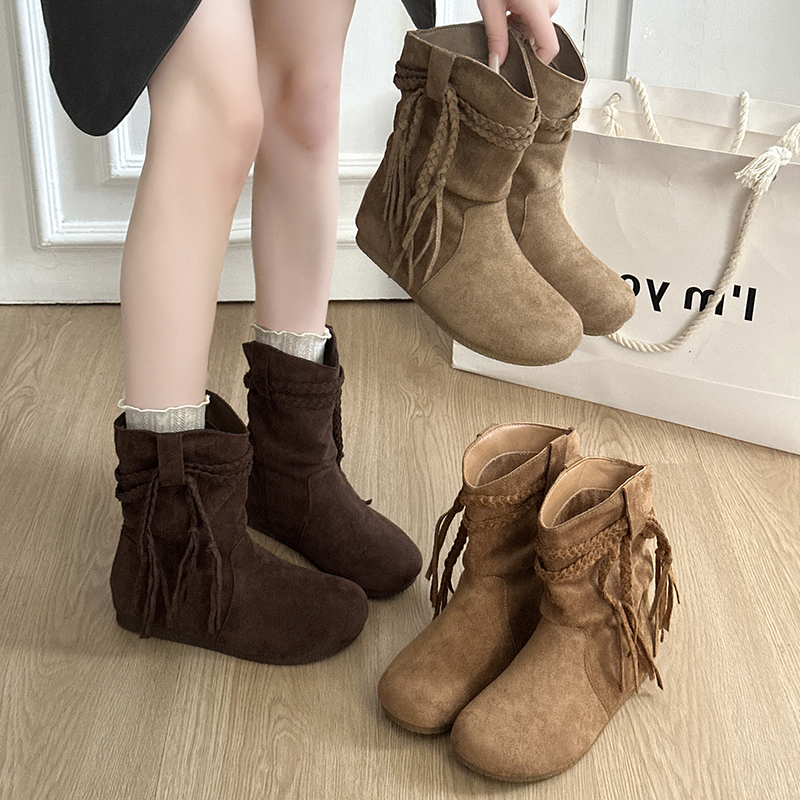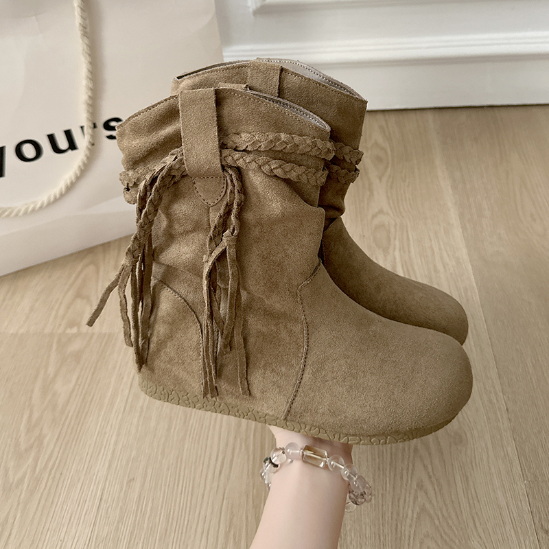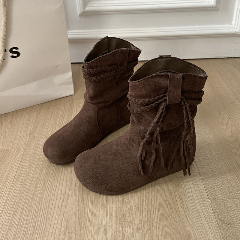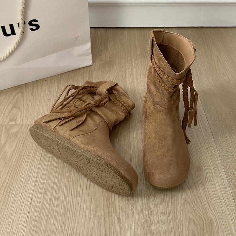 绒面平底堆堆瘦瘦靴勃肯鞋 新款 时髦流苏小短靴女2025秋季 巨好看