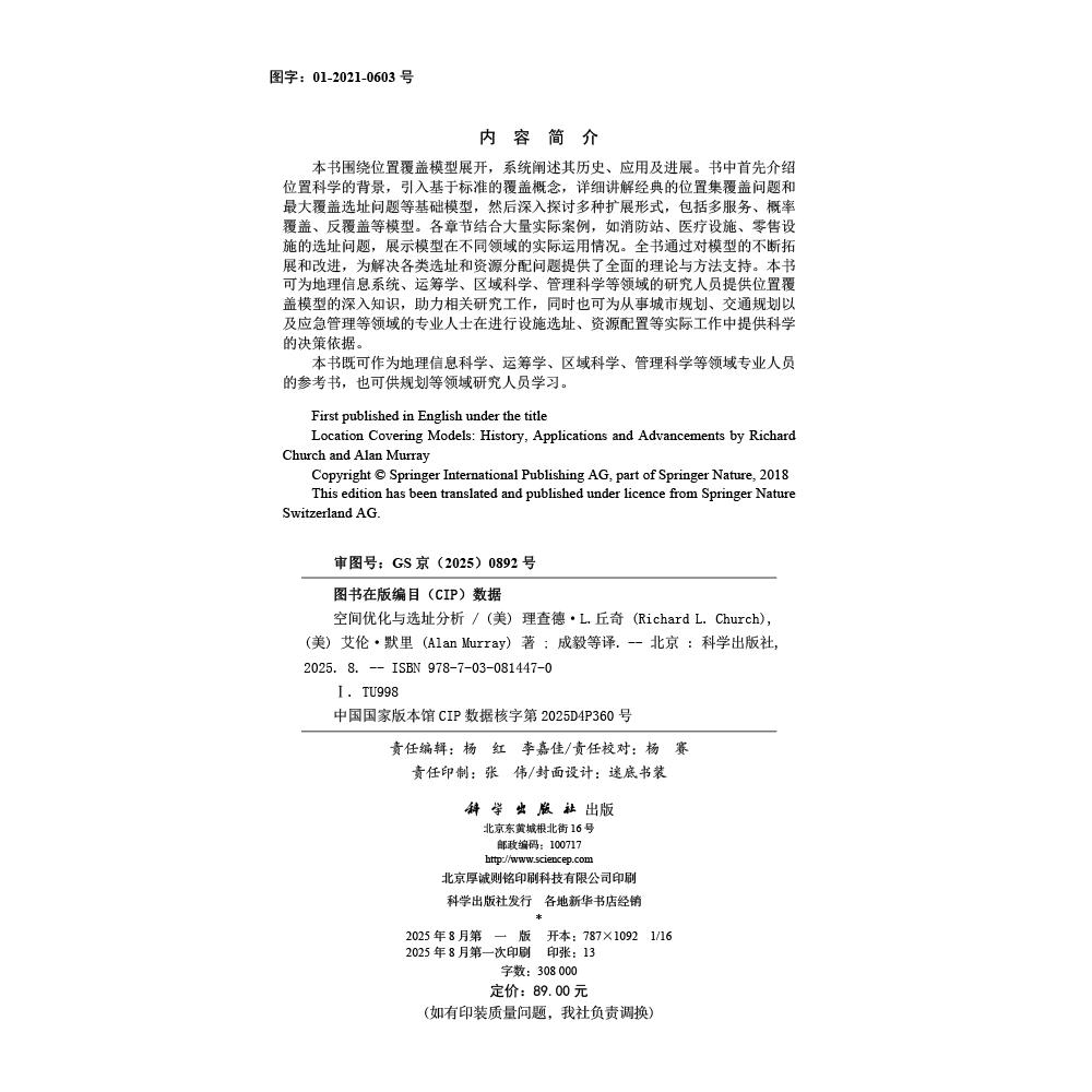 理查德·L.丘奇 科学出版 现货正版 著 Church Richard 社 译 成毅 正版 李书雪 等 空间优化与选址分析 书籍 马混阳