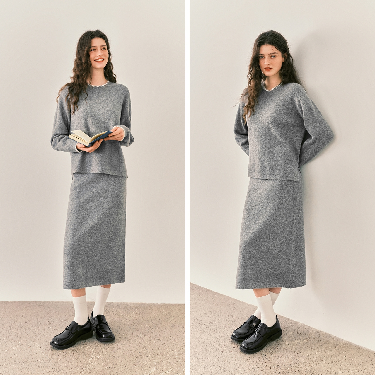 两件套 女冬撞色开叉毛衣直筒长裙2025新款 商场同款 森柔森马套装