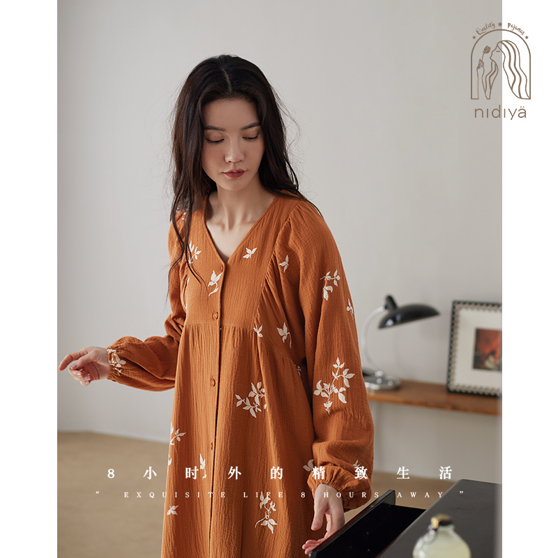 妮狄娅睡衣睡裙女秋季 纯棉纱布宫廷风长裙复古优雅春秋家居服 长袖