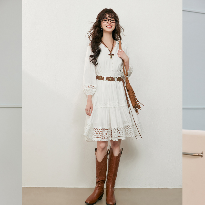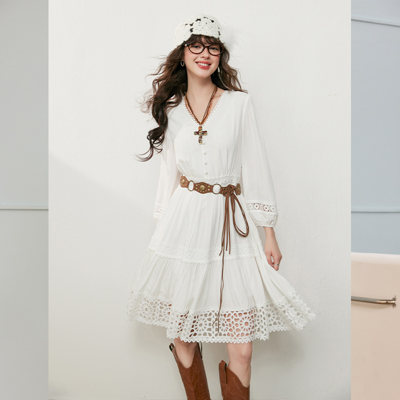 白鹿语法式 设计感收腰显瘦小白裙 复古镂空V领连衣裙25早秋新款
