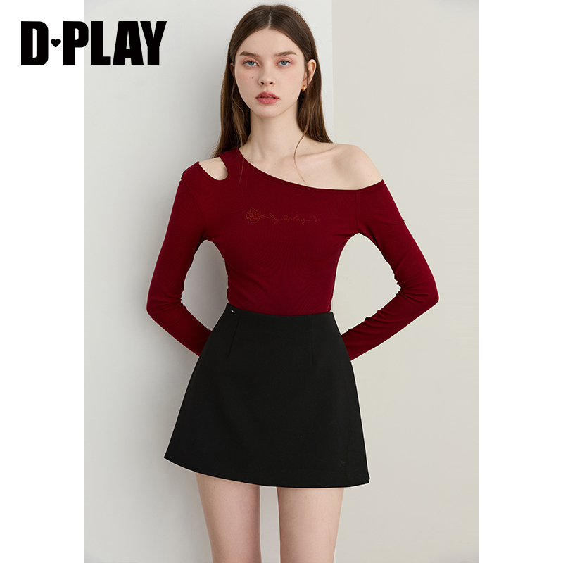 莱赛尔长袖 红色t恤女烫钻露肩设计修身 上衣 新款 DPLAY2025年秋季