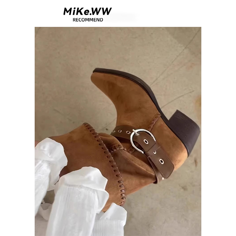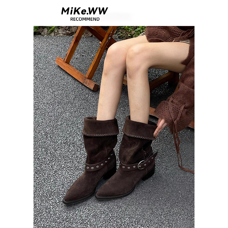 棕色复古西部牛仔靴女2025新款 尖头粗跟骑士靴堆堆靴短筒靴子 秋季