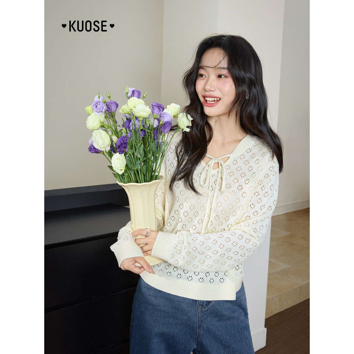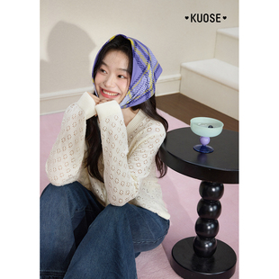 气质慵懒上衣薄款 阔色米白色v领镂空长袖 新款 女2025秋季 针织衫