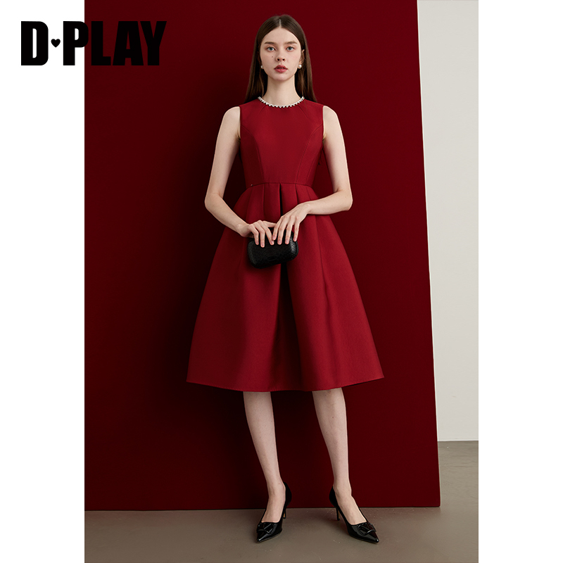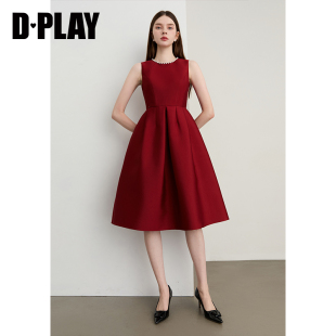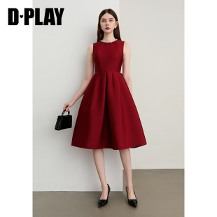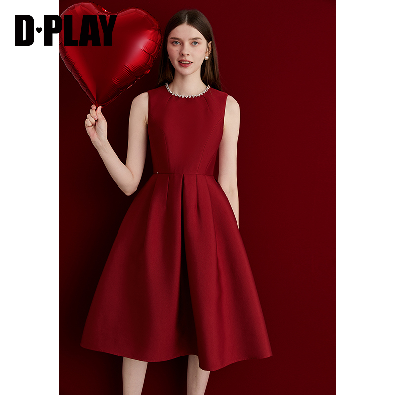 DPLAY2025秋季 红色连衣裙女气质缎面订婚敬酒服宴会礼服裙子 新款