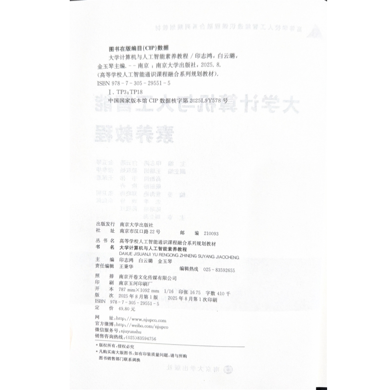金玉琴 白云璐 编著 南京大学出版 9787305295515 大学计算机与人工智能素养教程 社 印志鸿