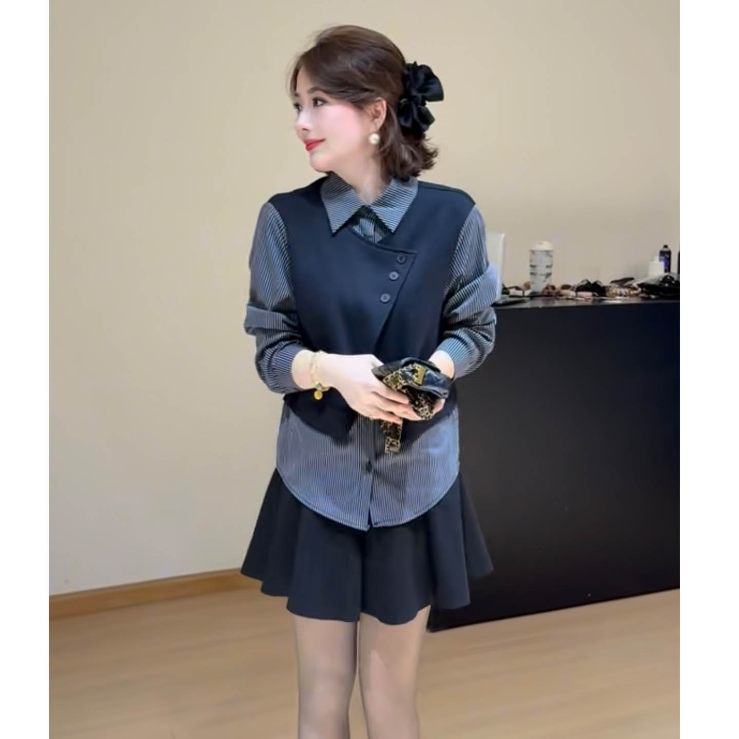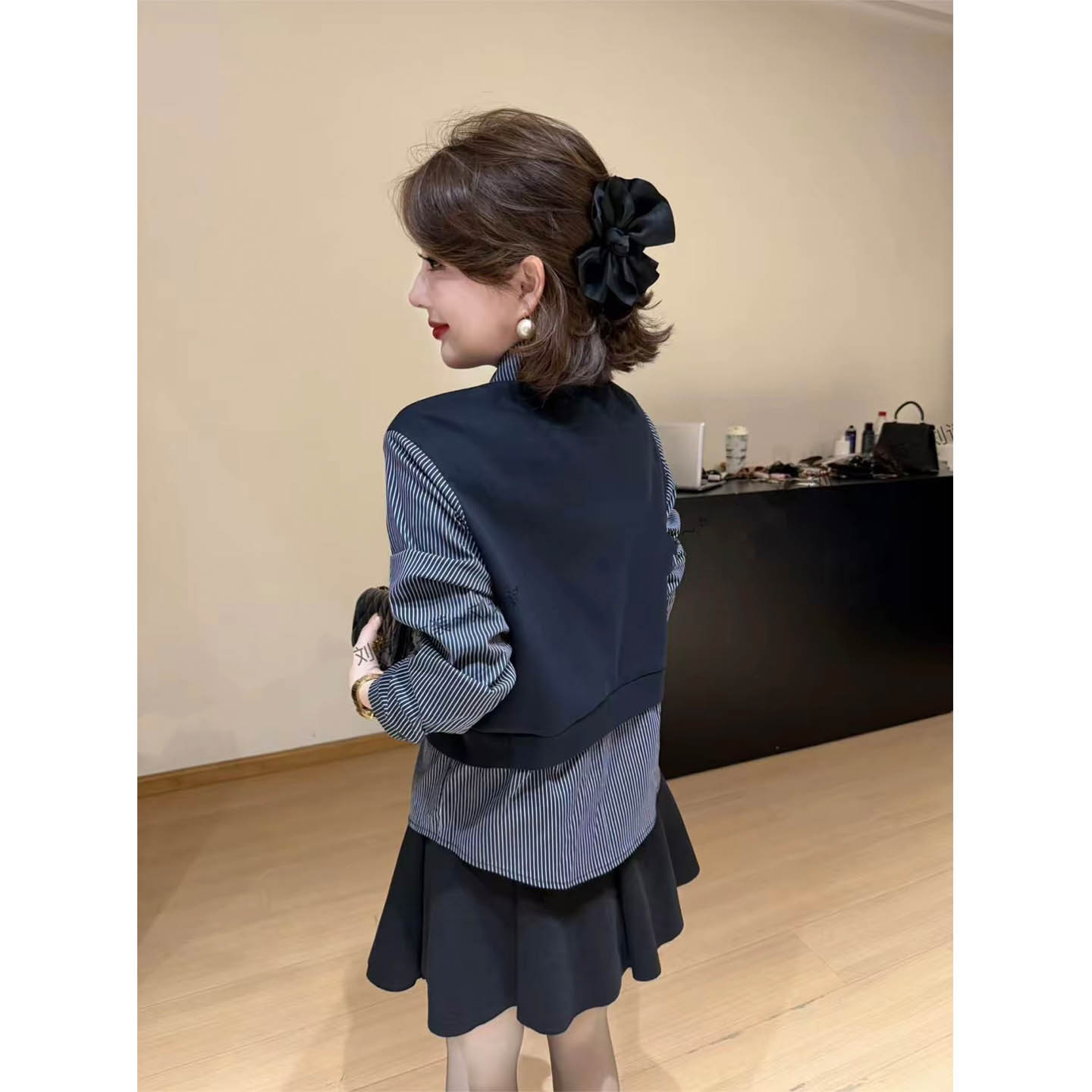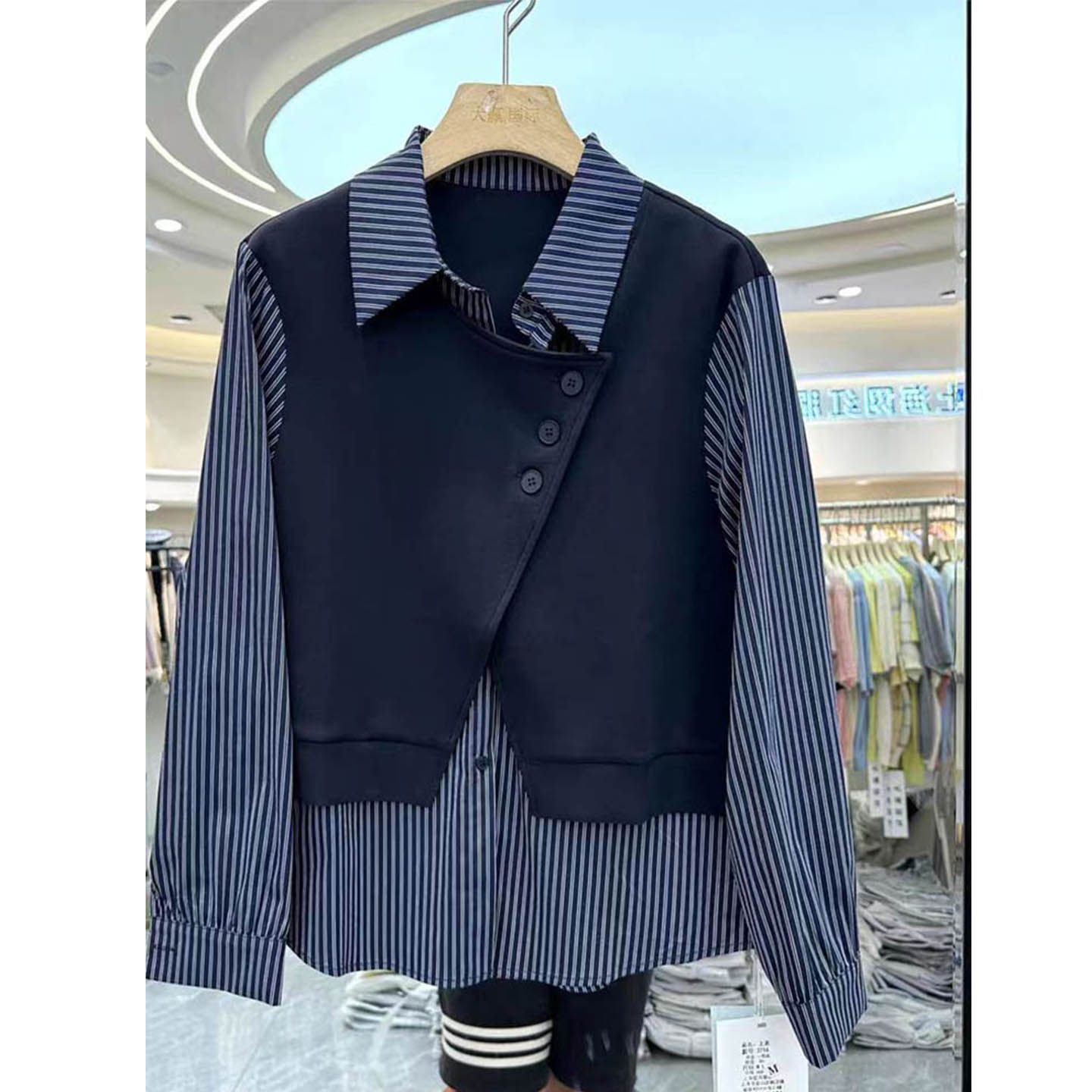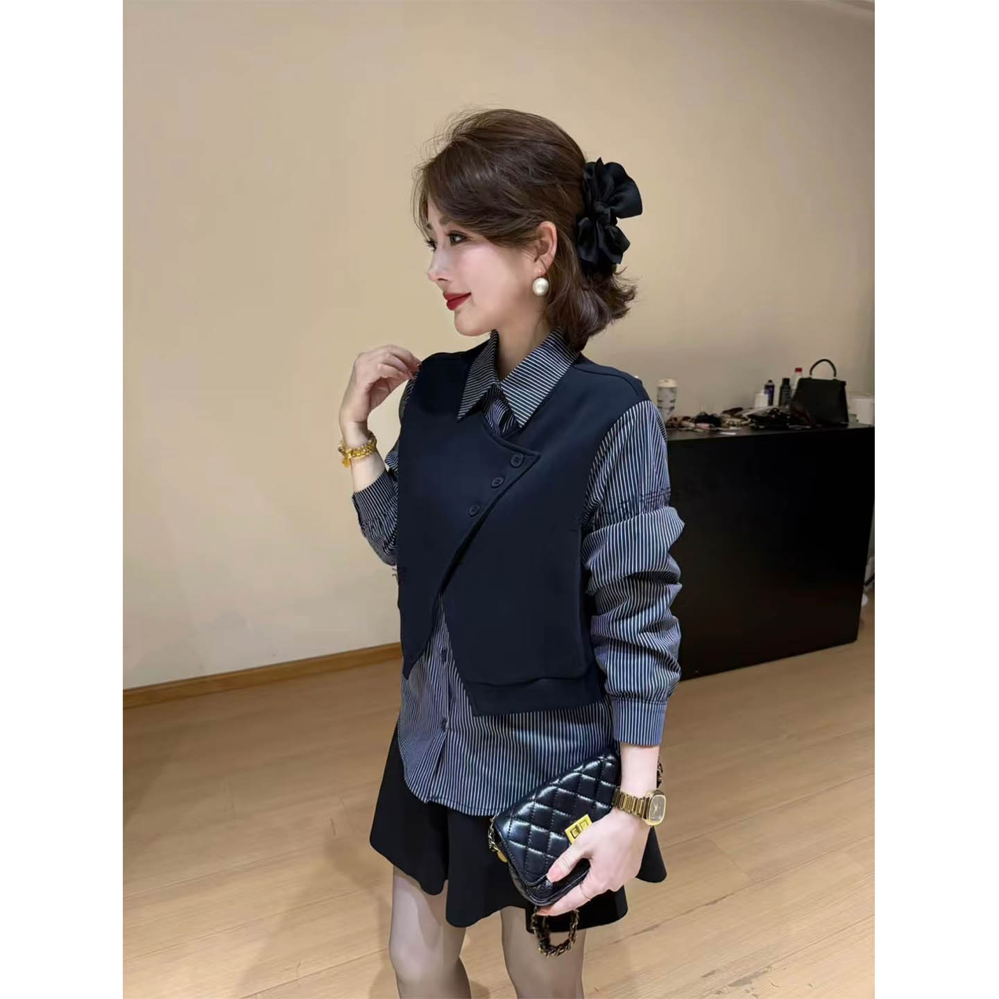 条纹长袖 2025秋季 女休闲洋气百搭韩版 马甲拼接假两件衬衫 上衣 新款