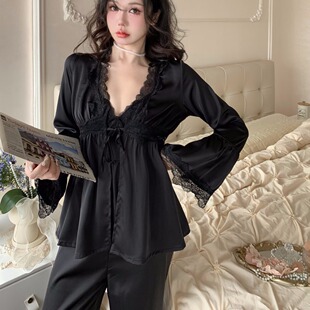 睡衣女法式 赵露思同款 吊带长裤 新款 性感蕾丝三件套家居服冰丝 秋季