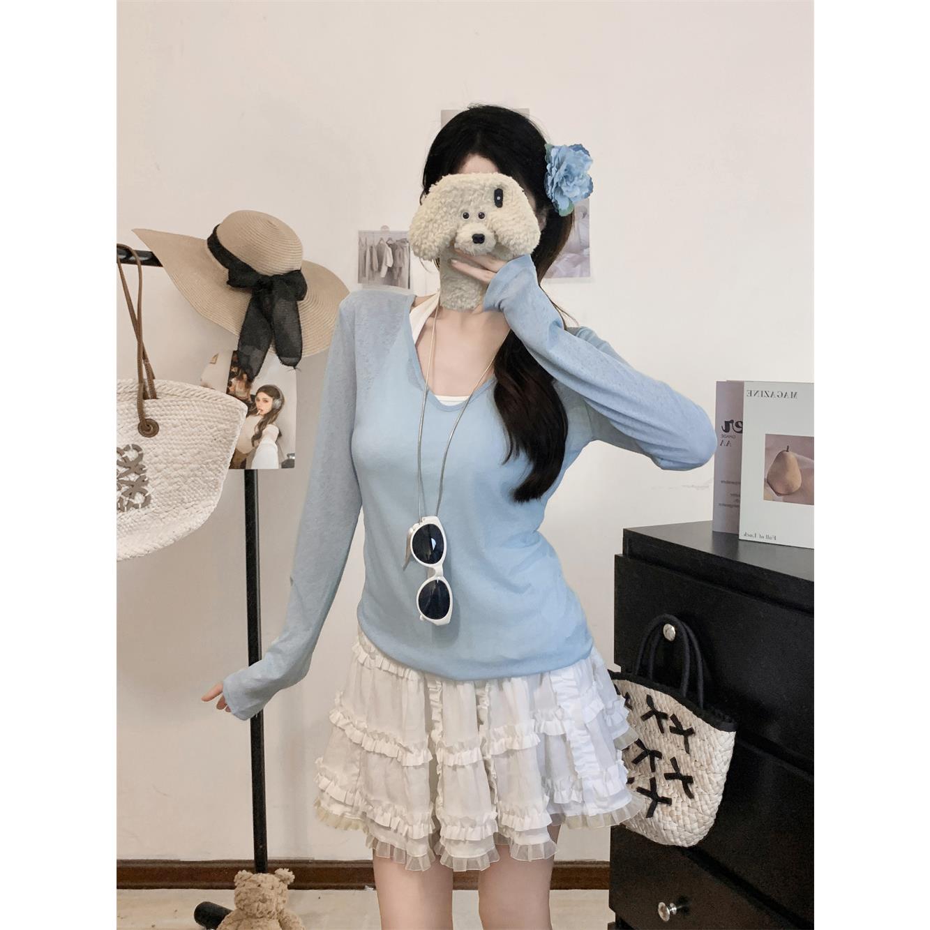 纯欲风长袖 松弛感防晒罩衫 微透V领天丝外搭上衣秋季 薄款 T恤 女夏季