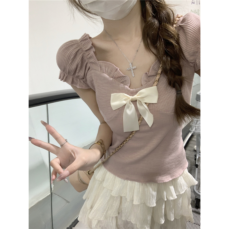 收腰短款 一字肩针织t恤女短袖 蝴蝶结不规则修身 法式 露肩上衣 夏季