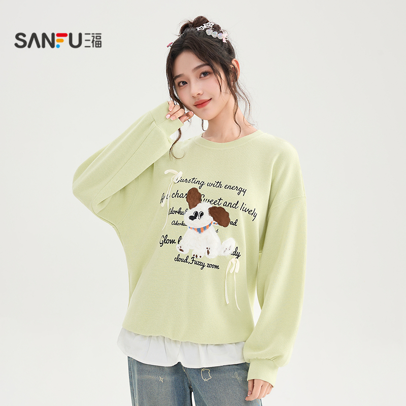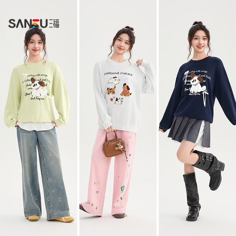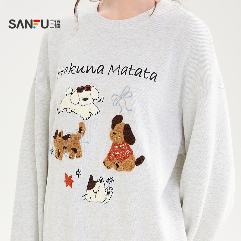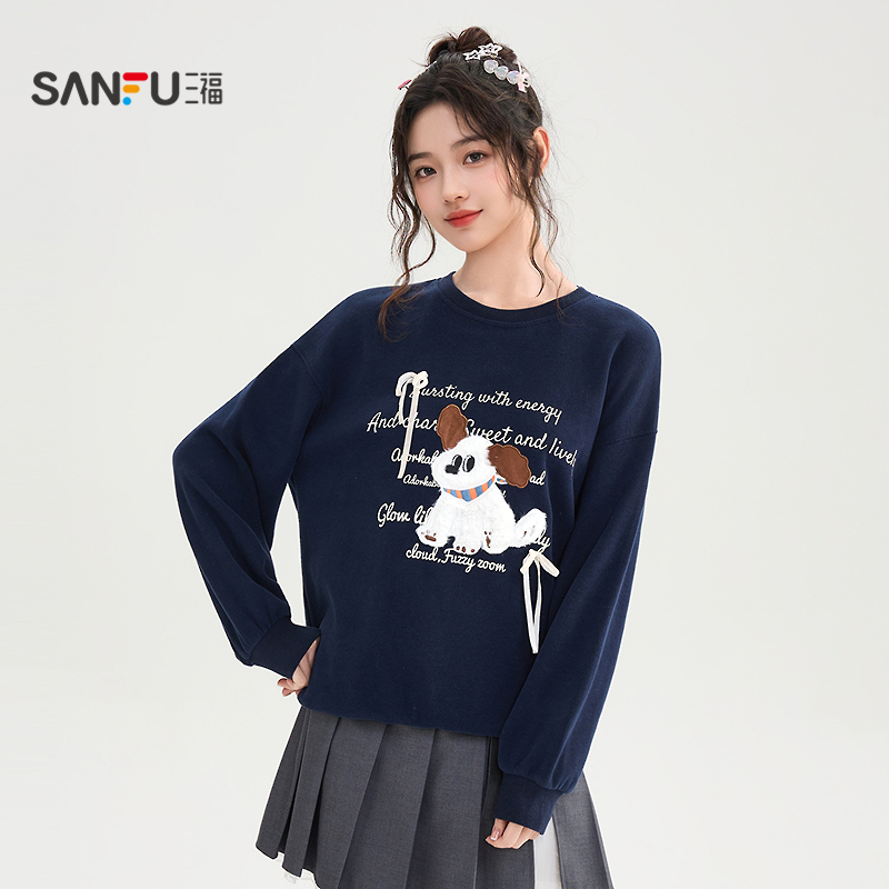 三福卫衣2025秋季 508610 可爱小狗绣花圆领宽松上衣女装