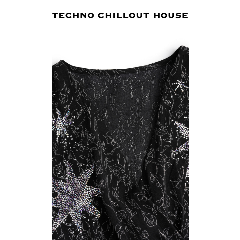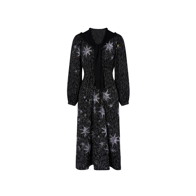 T75C30E1080 新款 TCH轻奢星空夜花烫钻气质收腰长袖 连衣裙女25秋季