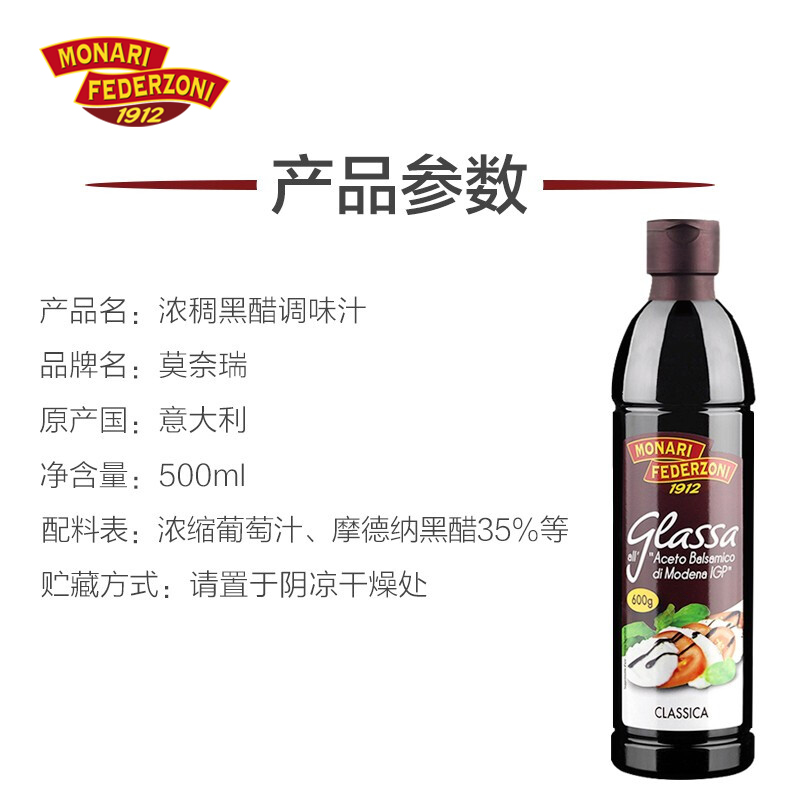 莫奈瑞意大利进口浓稠黑醋500ml调味汁质地浓稠醇厚葡萄酿造西餐