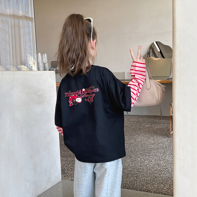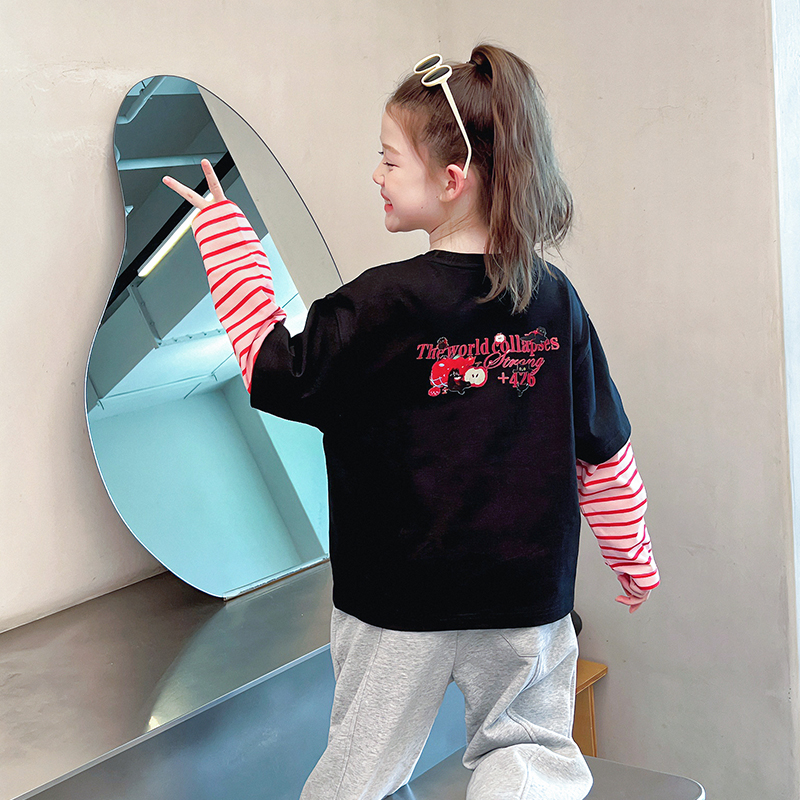 新款 女孩洋气假两件t恤大童潮搭撞色打底衫 女儿童上衣2025春秋装