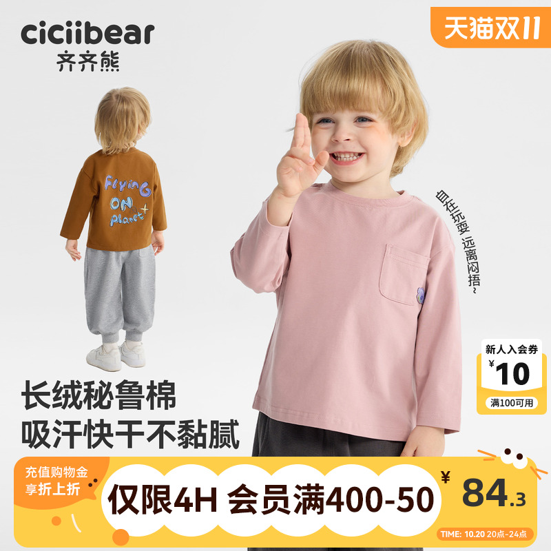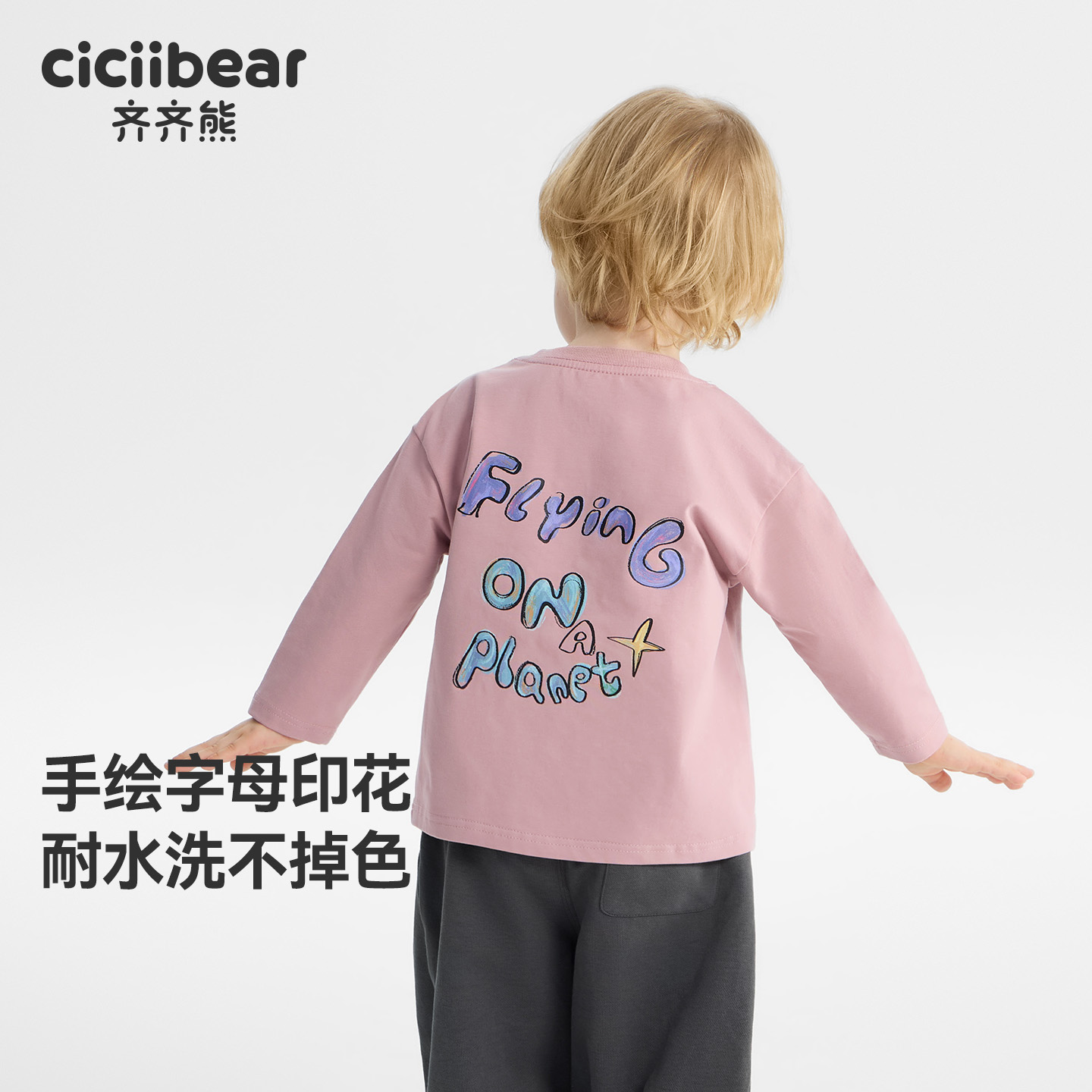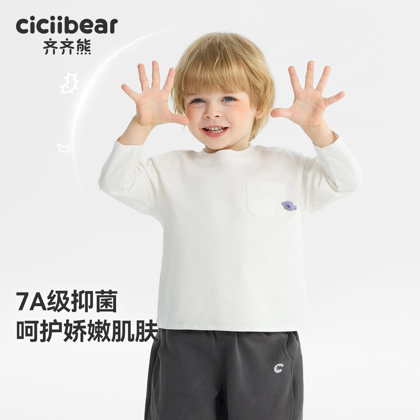 宝宝白色上衣儿童纯色2025新款 抗菌纯棉齐齐熊男童t恤长袖 春秋款