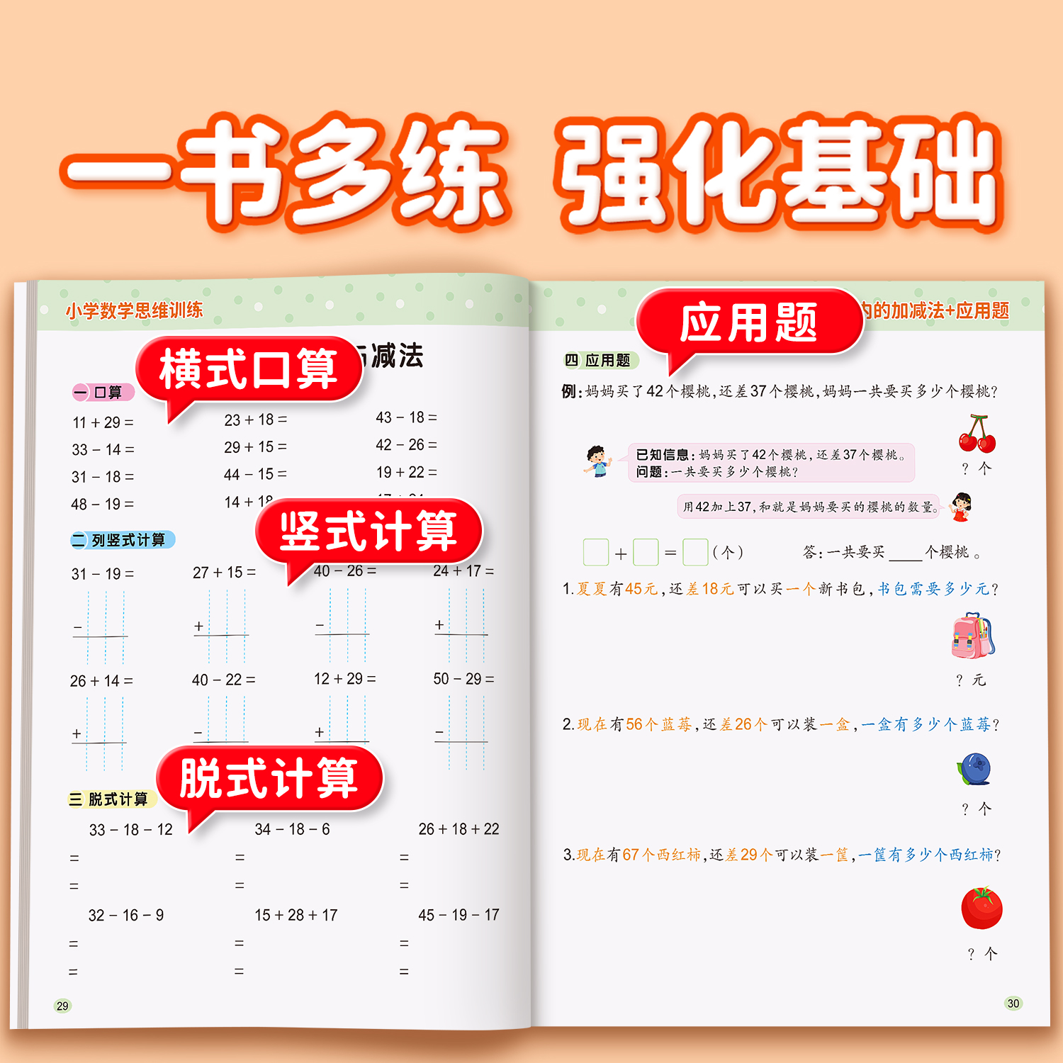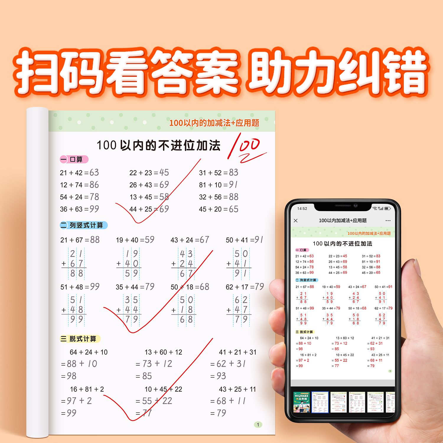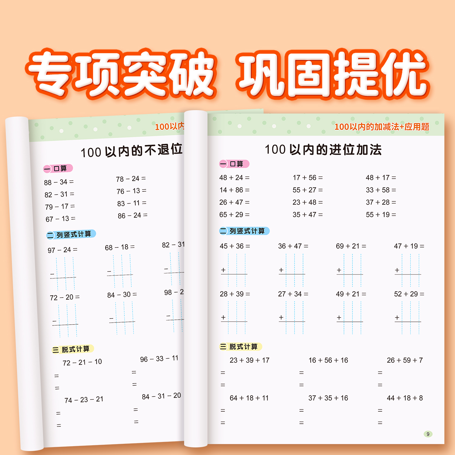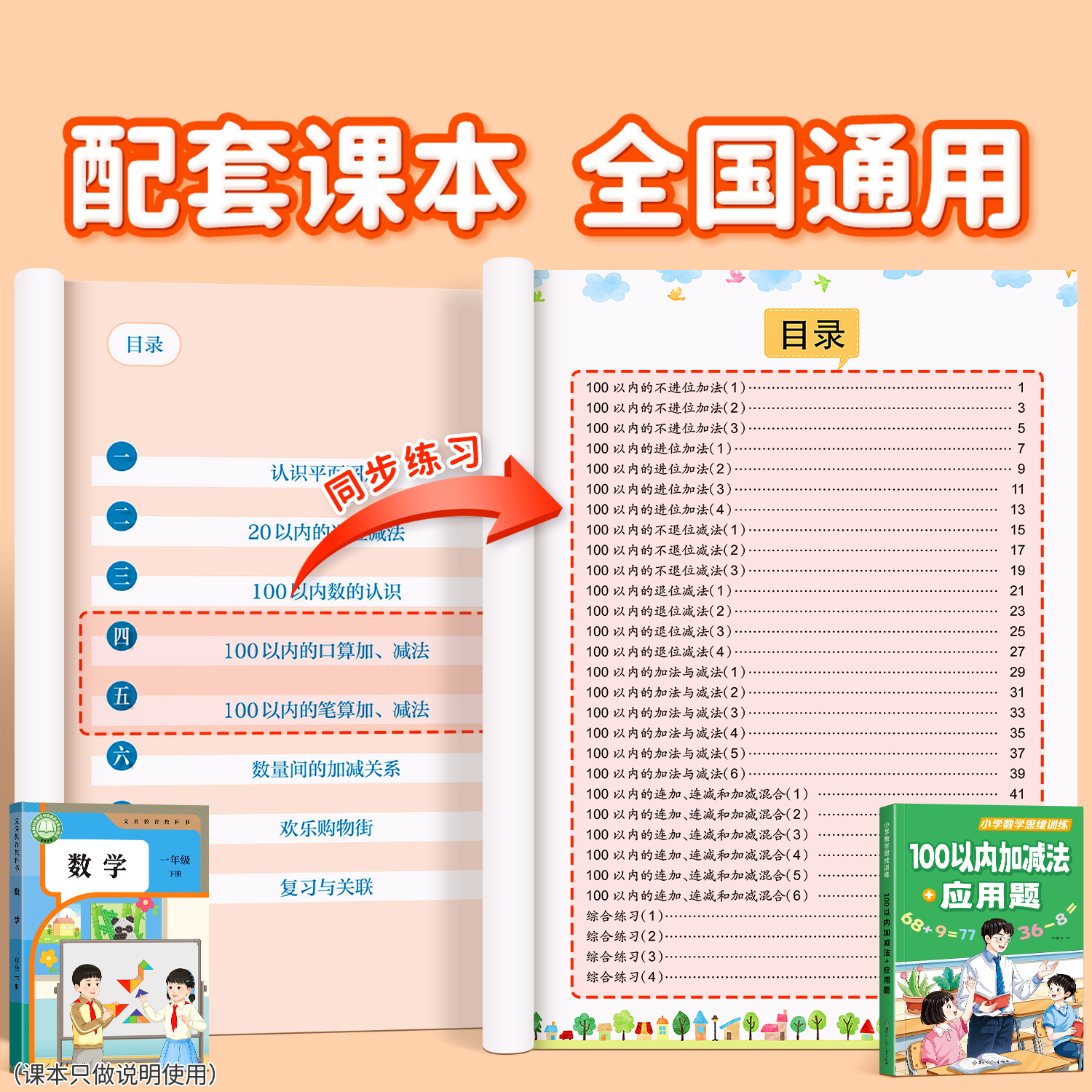 应用题计算题100以内进退位加减法混合运算练习题册一百以内加减法人教版 脱式 一年级数学每日一练 竖式 100以内加减法专项练习本横式
