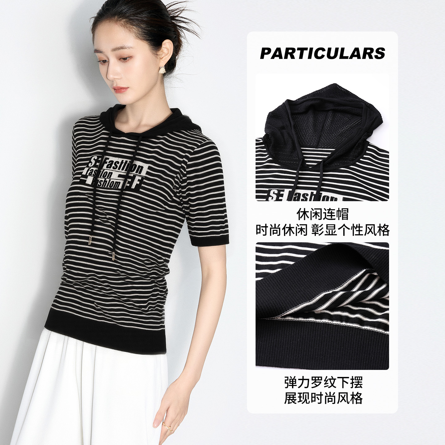 T恤上衣小衫 短袖 气质女 条纹莱赛尔连帽针织衫 马天奴2025春夏新款