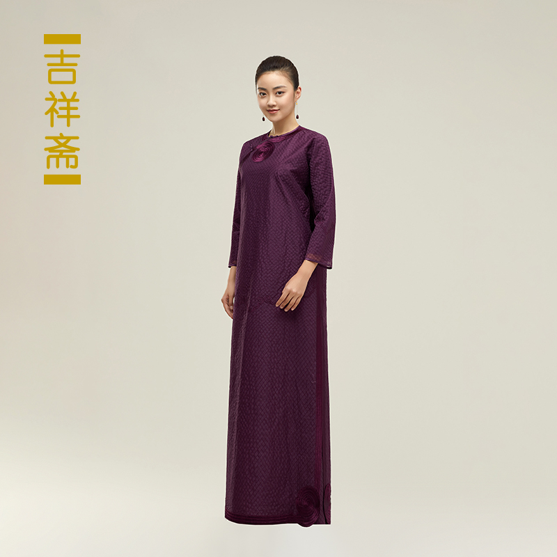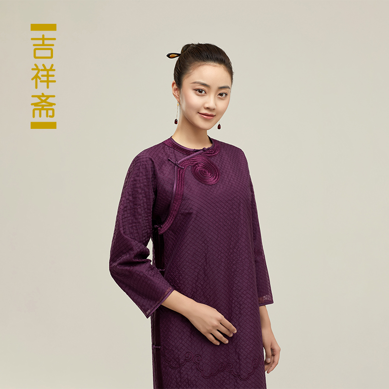 斜襟圆领盘扣格子绣花国风复古礼服正品 吉祥斋女装 紫薇阁长衫