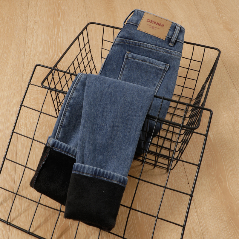 保暖高腰弹力修瘦铅笔加厚长裤 新款 女2025冬季 蓝色加绒小脚牛仔裤