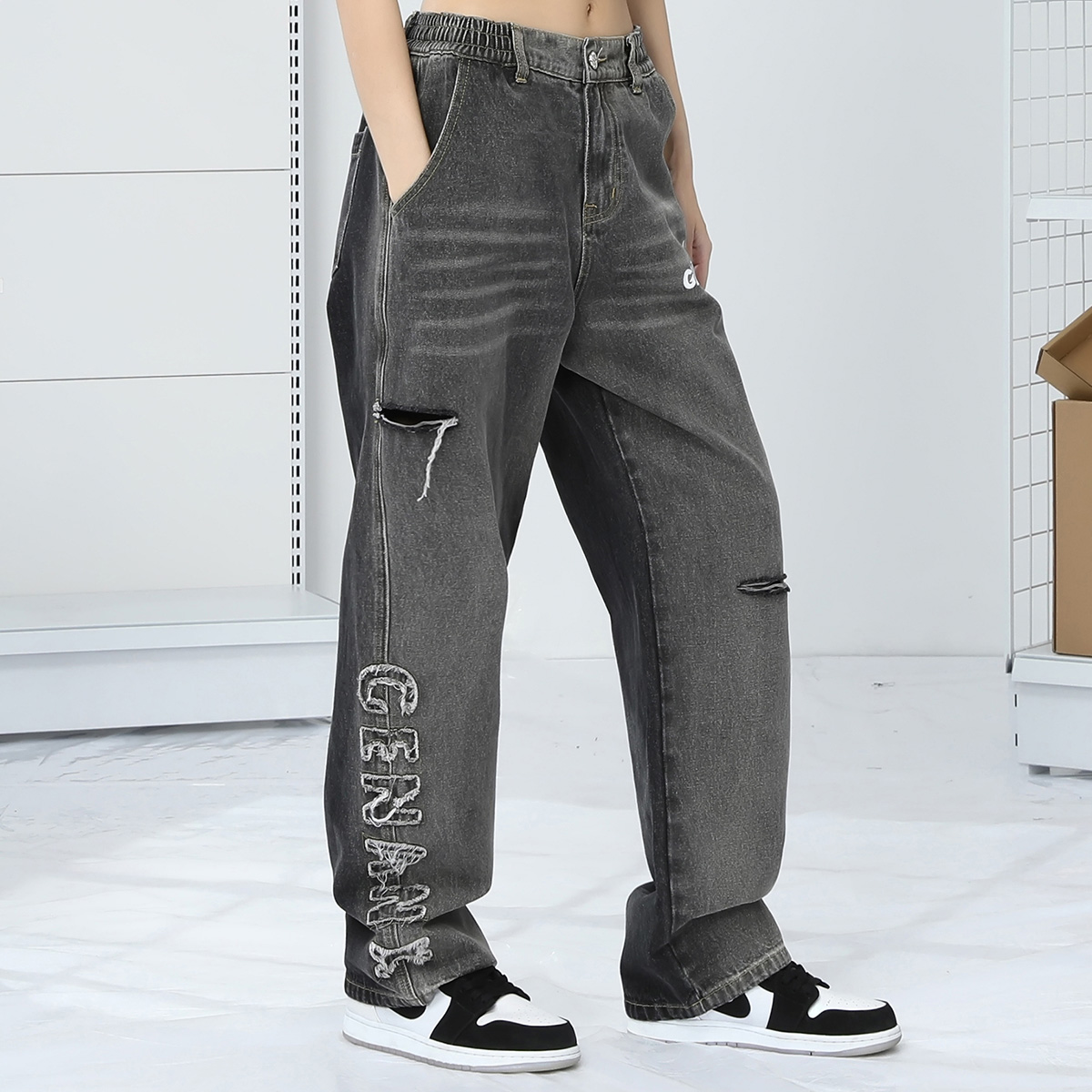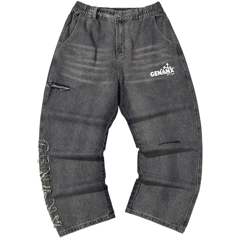 黑灰色浅色宽松破洞牛仔裤 阔腿牛仔裤 新款 GENANX闪电潮牌春季