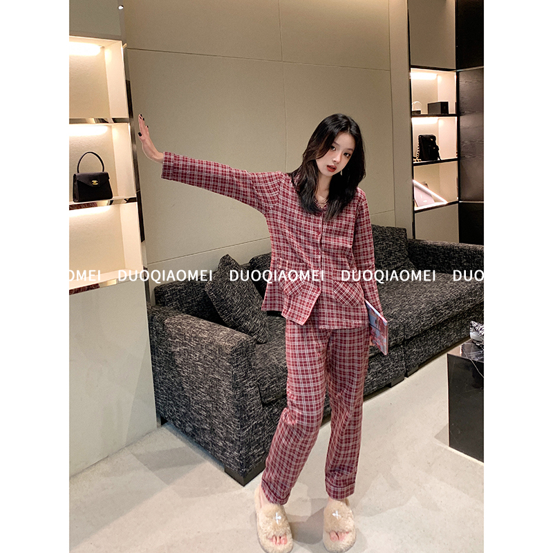 格子大码 纯棉长袖 气质时尚 女装 2025年新款 家居服套装 睡衣女春秋款