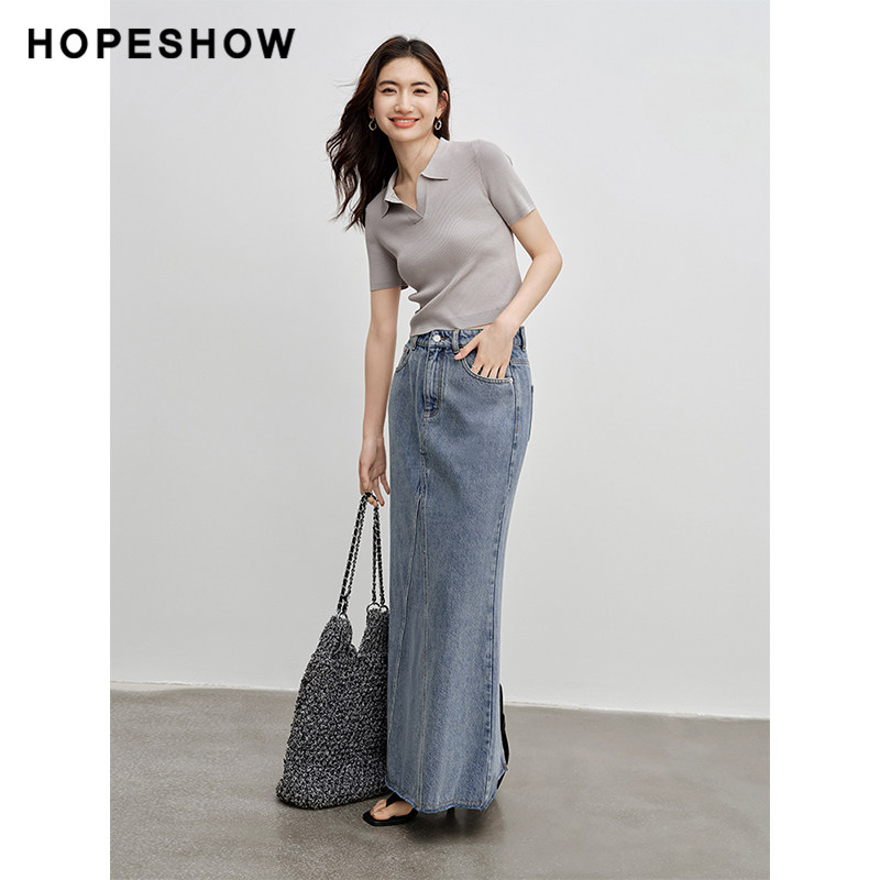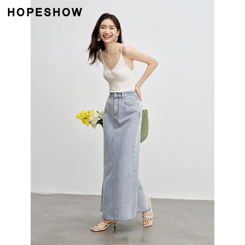红袖 设计感轻薄中裙 水洗磨毛一粒扣牛仔半身裙hopeshow2024夏新款