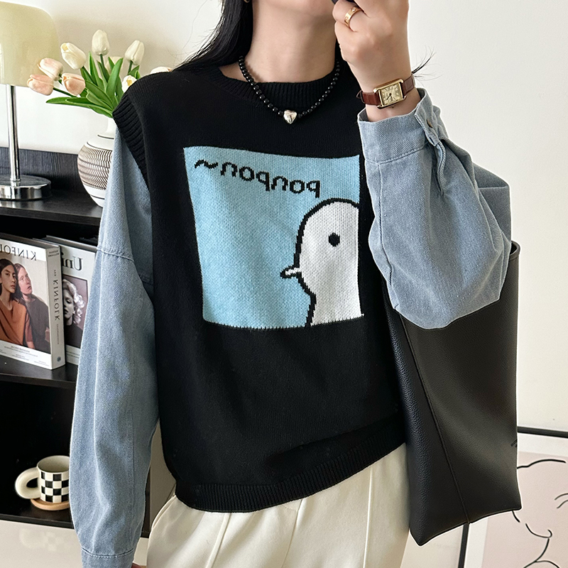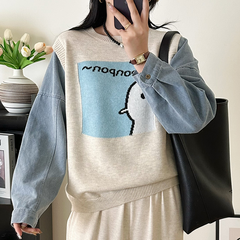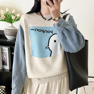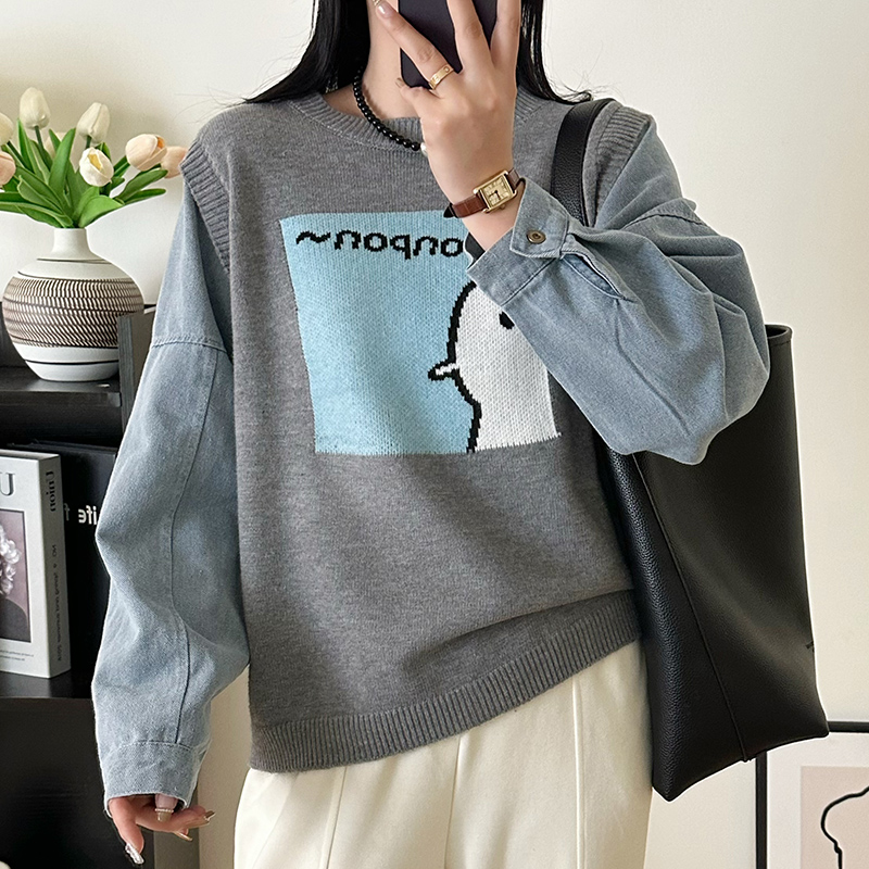 卡通宽松针织衫 爆款 上衣 拼接假两件毛衣女秋冬2024新款 早秋牛仔袖