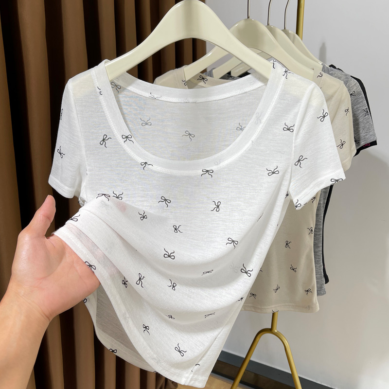 大圆领内搭冰丝短袖 2025夏新款 面膜t上衣 打底衫 灰色超薄针织薄款