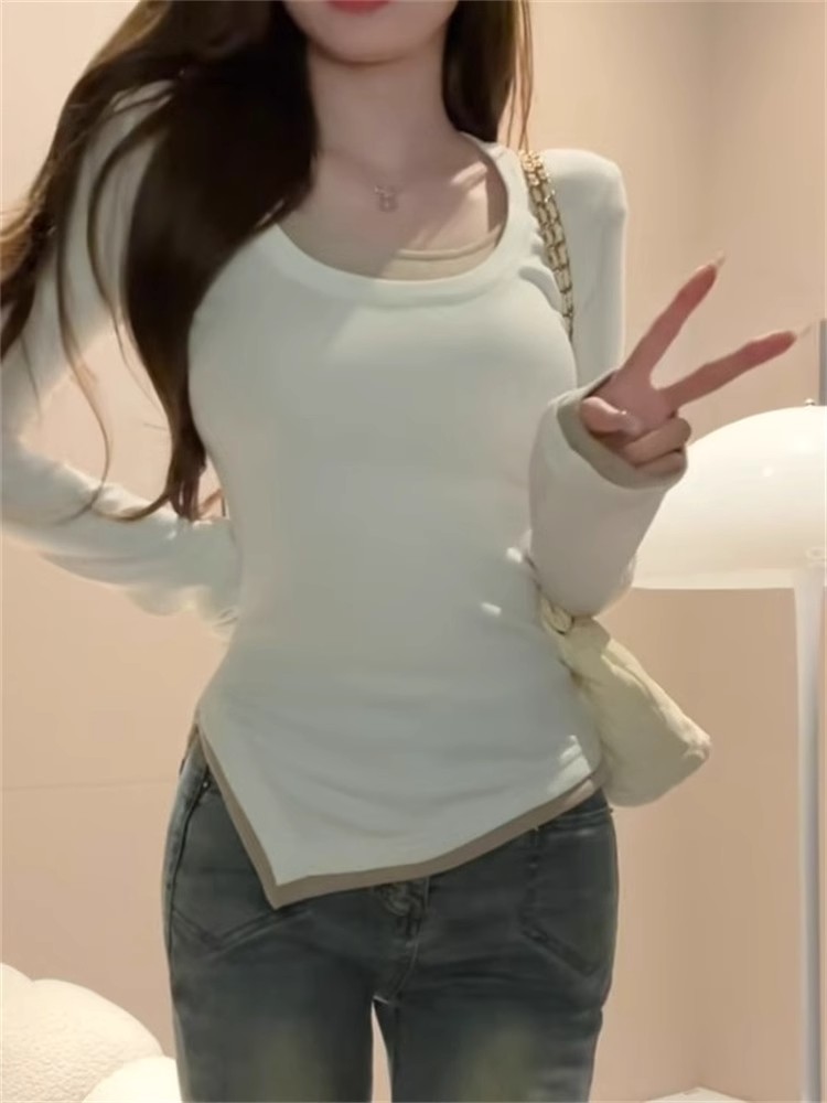 独特别致辣妹设计内搭修身 t恤女秋季 上衣 长袖 莫代尔假两件打底衫