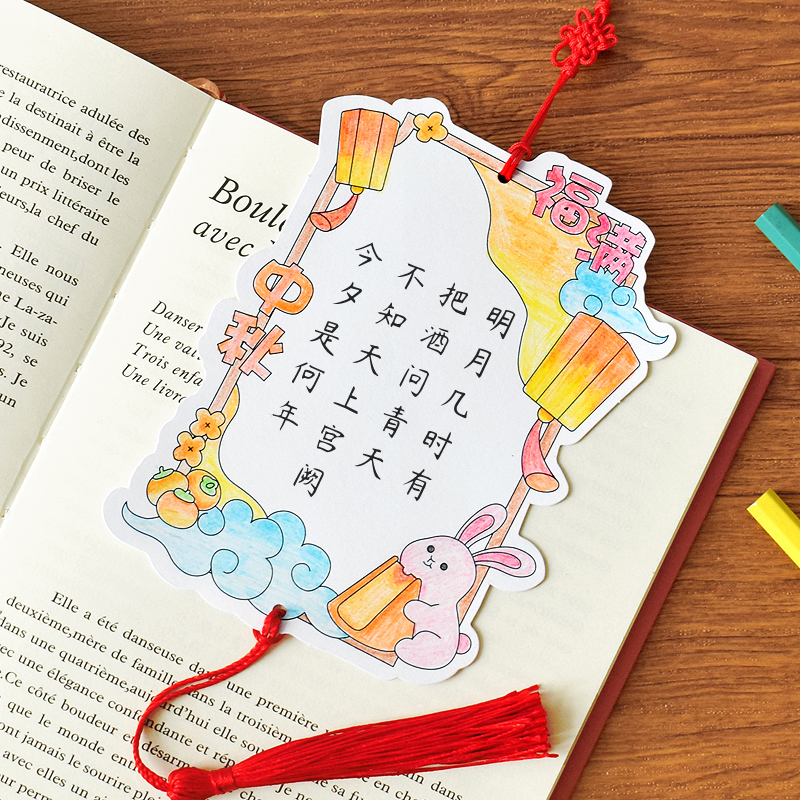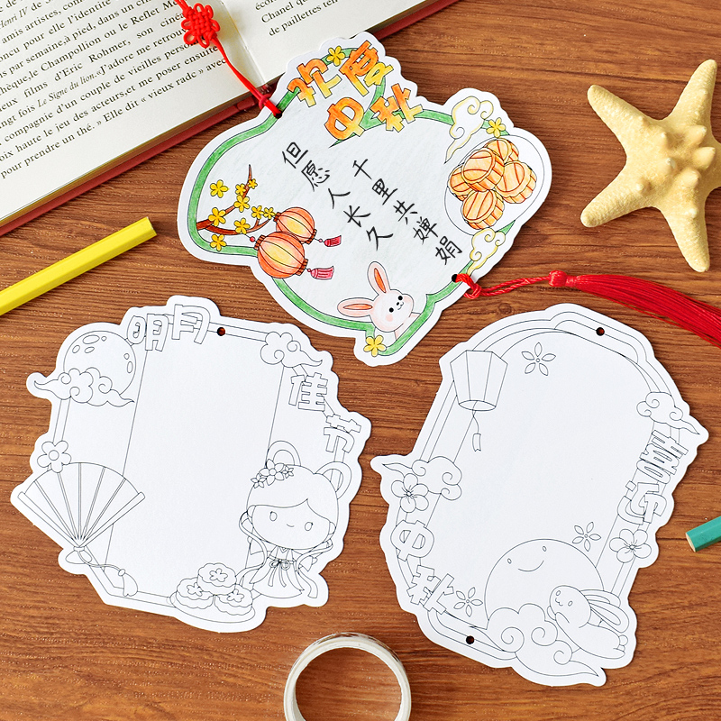 中秋节快乐填色书签空白线稿纸月饼玉兔可爱卡通装 饰吊卡学校老师布置班级手工作业优秀作品楼道展示墙挂卡片