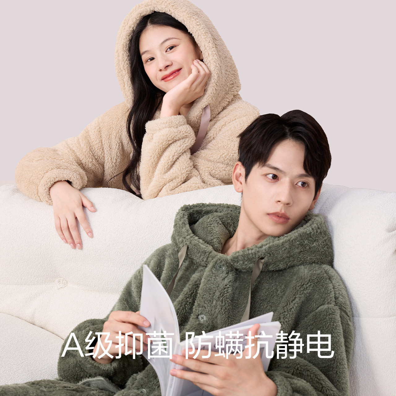 红豆连帽家居服睡袍加厚泡泡绒男士 浴袍抗菌抗静电防螨女外穿睡衣