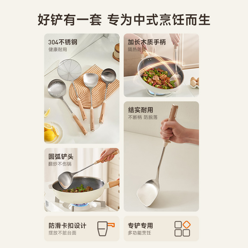 九阳食品级304不锈钢套铲锅铲汤勺漏勺线勺加长手柄防脱落弯折炊
